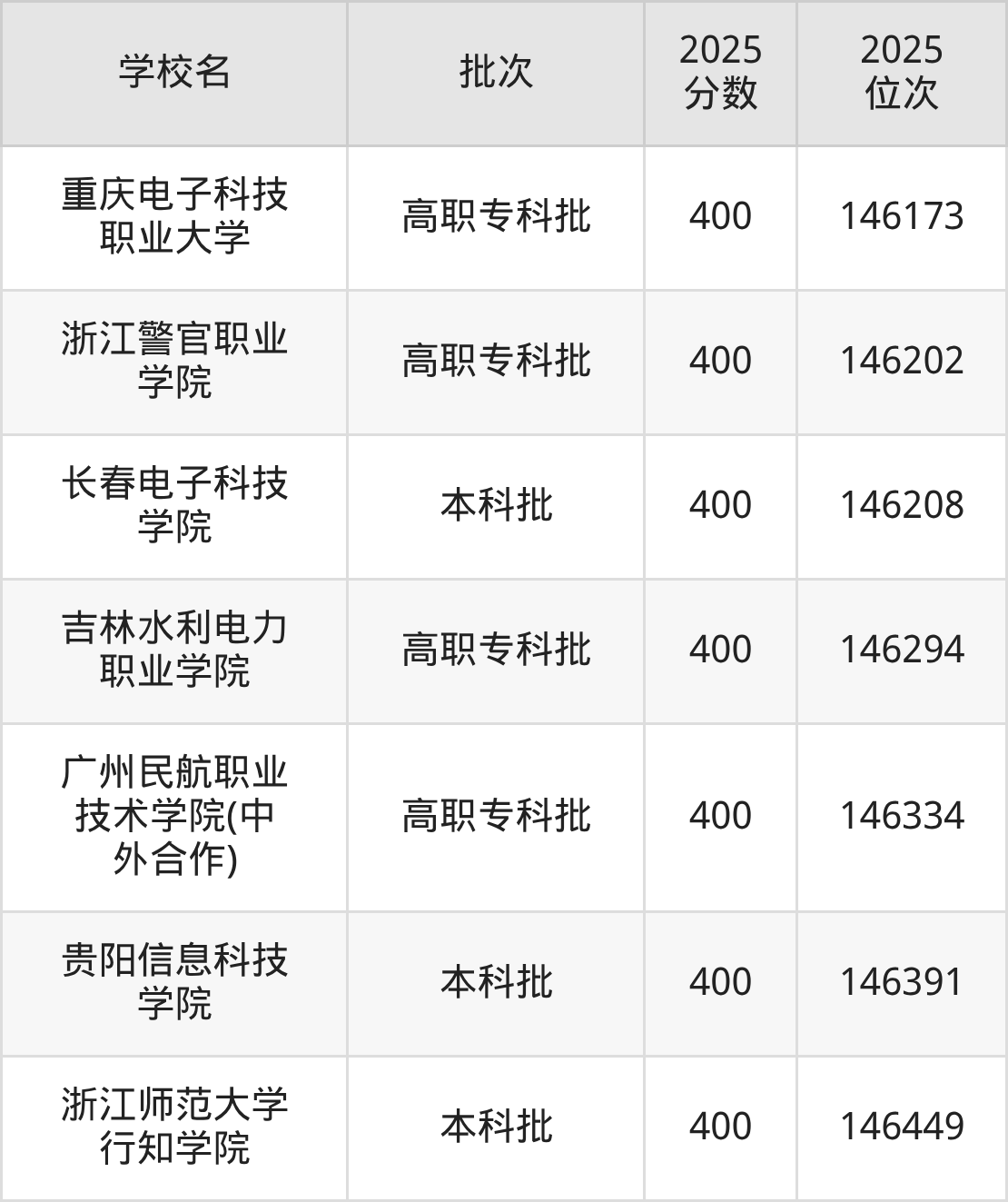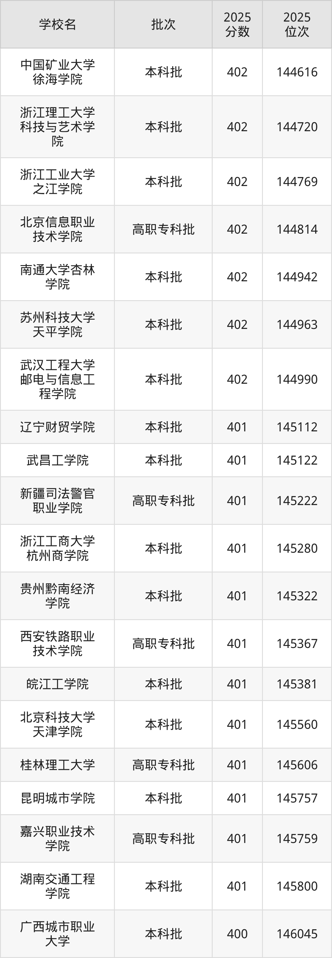 贵州高考401分:历史类排名63323位、物理类排名145989位。该分数位次对应能上的大学历史类有湖南科技职业学院、通化医药健康职业学院;物理类有桂林理工大学、浙江工商大学杭州商学院,更多名单如下文所示,2026届考生可参考。