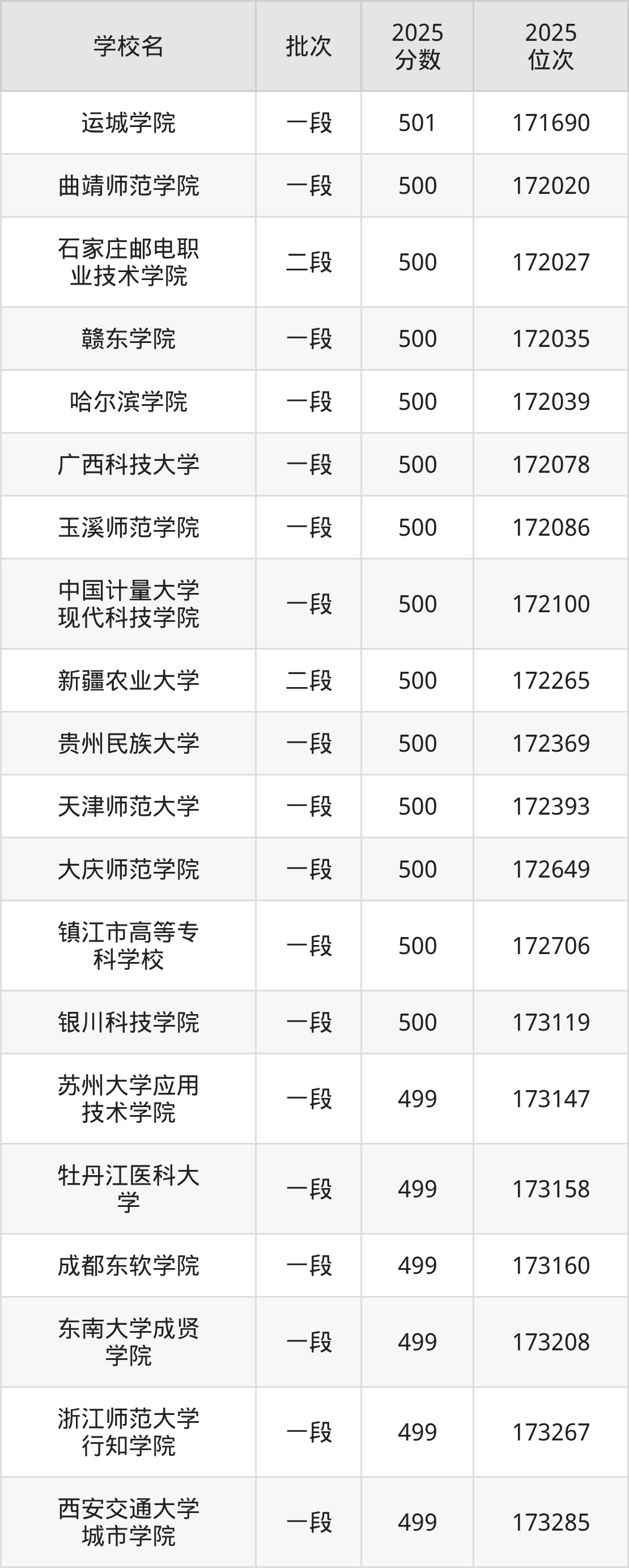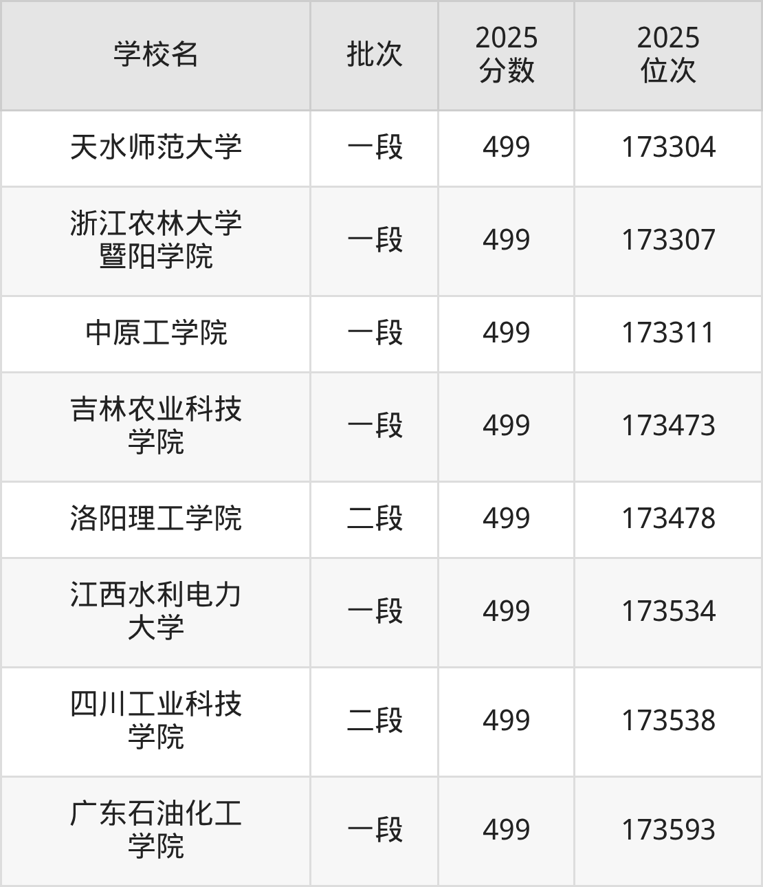这些都是2026年高考172011名~173134名考生可以报考的大学,更多学校名单如下表所示: