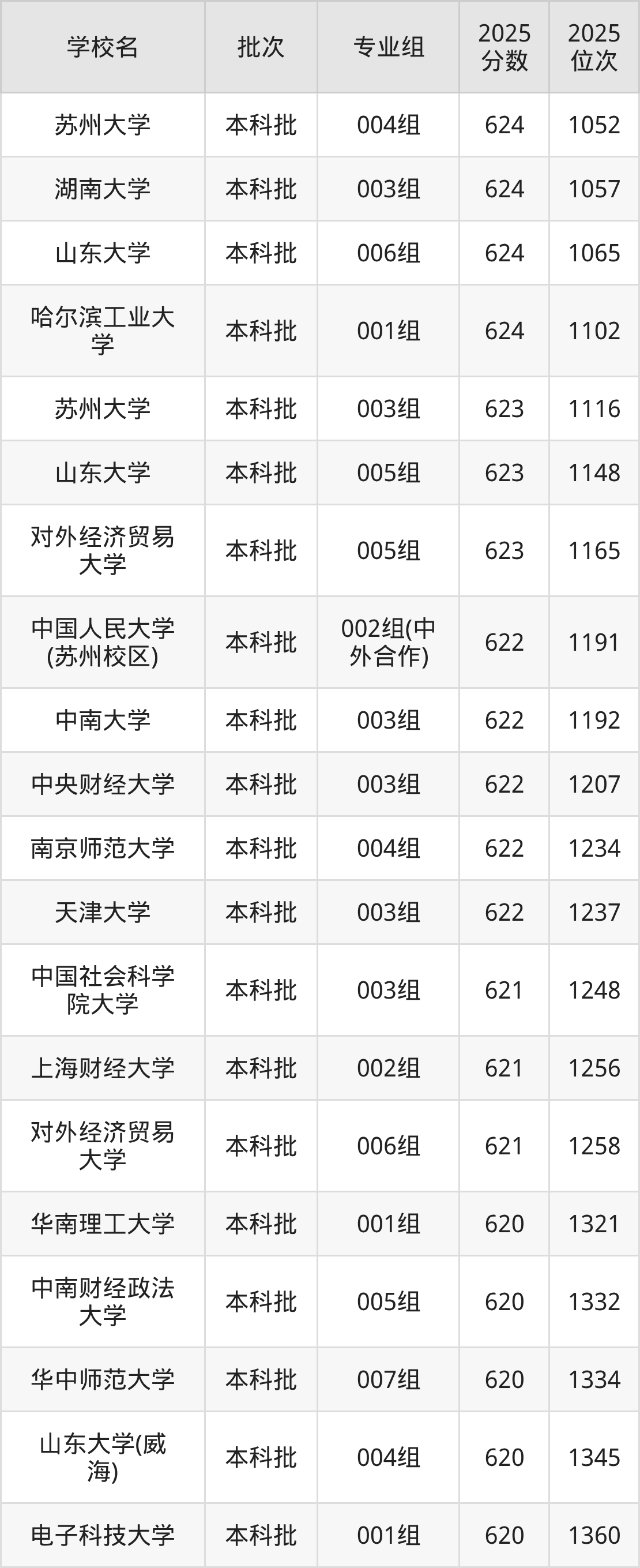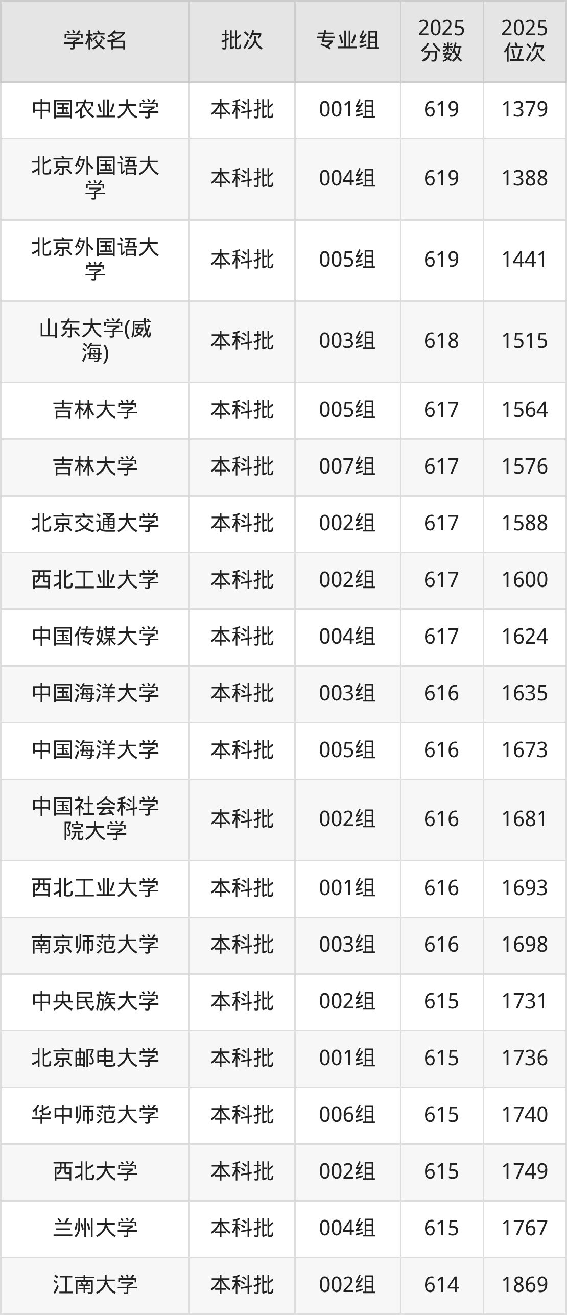 2025年安徽高考历史类617分(1546名~1630名)能上的大学有北京交通大学002组、吉林大学005组、吉林大学007组、西北工业大学002组等。