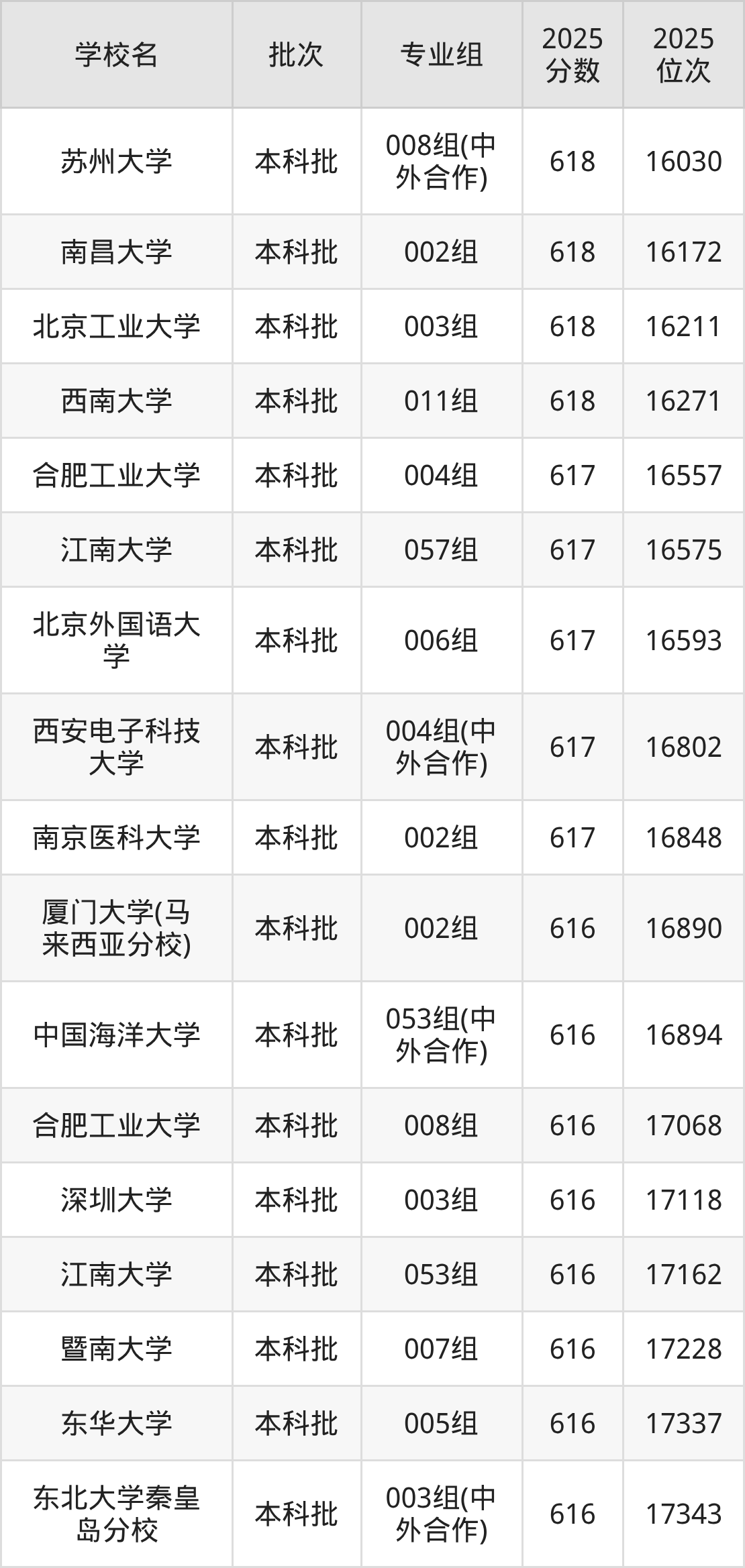 2025年安徽高考物理类617分(16364名~16857名)能上的大学有北京外国语大学006组、合肥工业大学004组、江南大学057组、南京医科大学002组等。