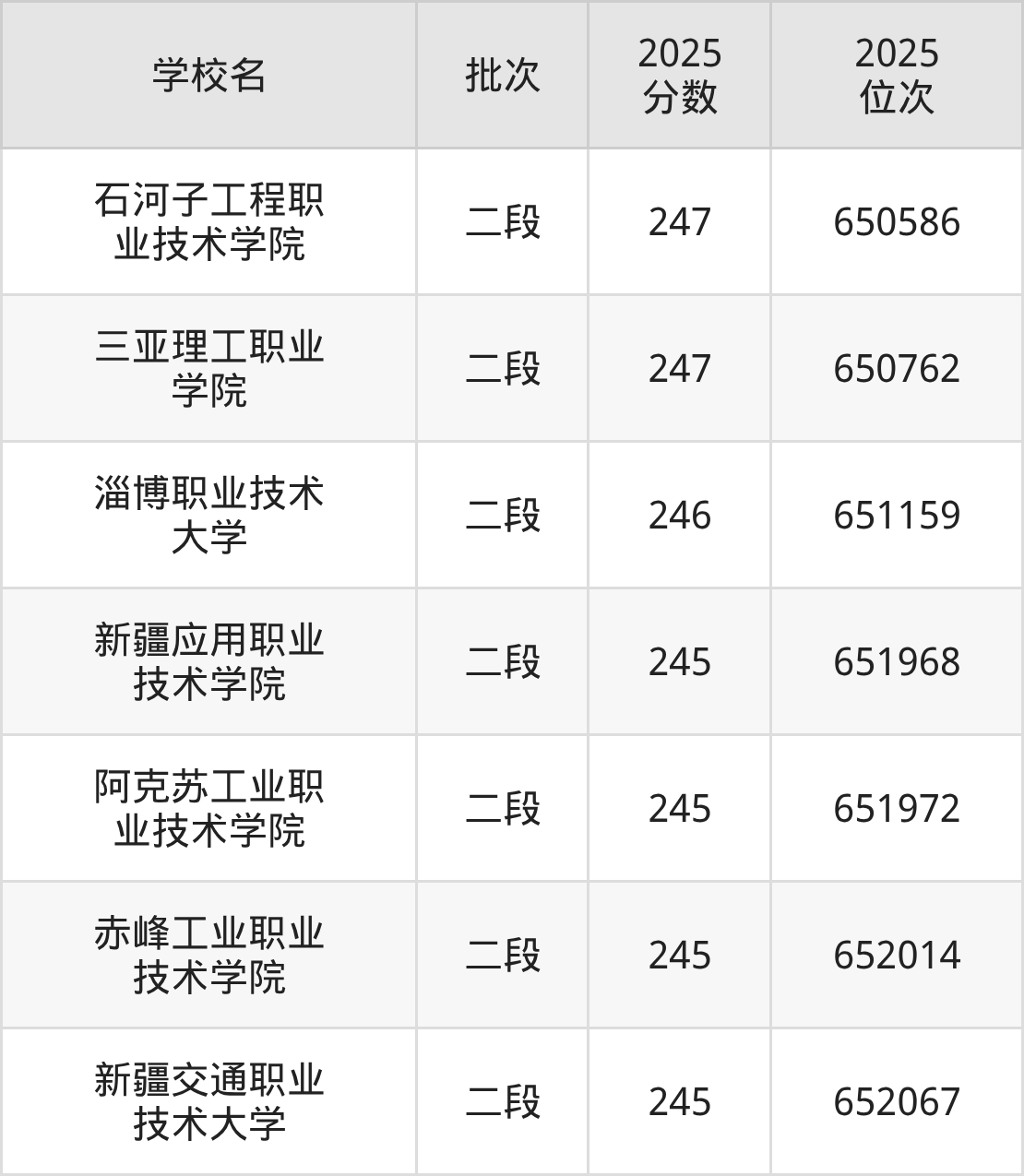 另外录取位次低于该区间(较稳妥)的有新疆应用职业技术学院(651968名)、阿克苏工业职业技术学院(651972名)等;录取位次高于该区间(可冲)的有三亚理工职业学院(650762名)、石河子工程职业技术学院(650586名)等。