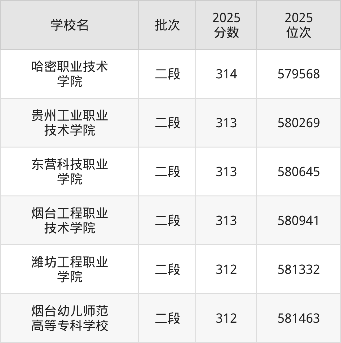 2025年山东高考313分(579751名~581248名)能上的大学有贵州工业职业技术学院、烟台工程职业技术学院、东营科技职业学院。