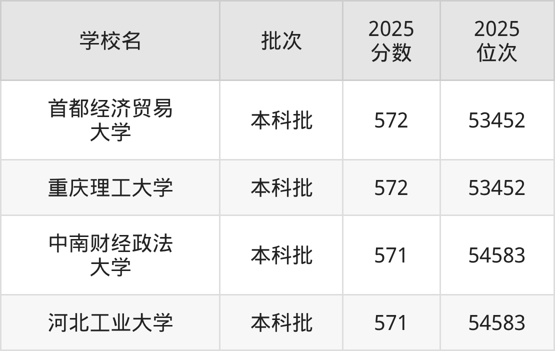 2025年河北高考物理类571分(53453名~54583名)能上的大学有中南财经政法大学、河北工业大学。