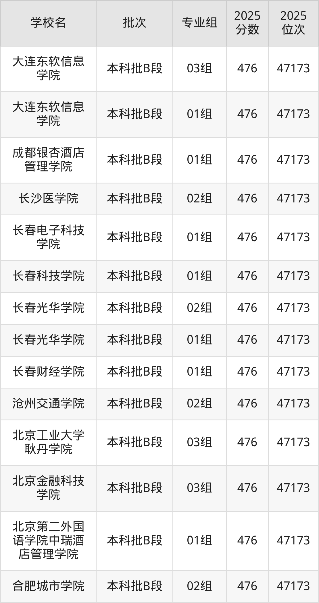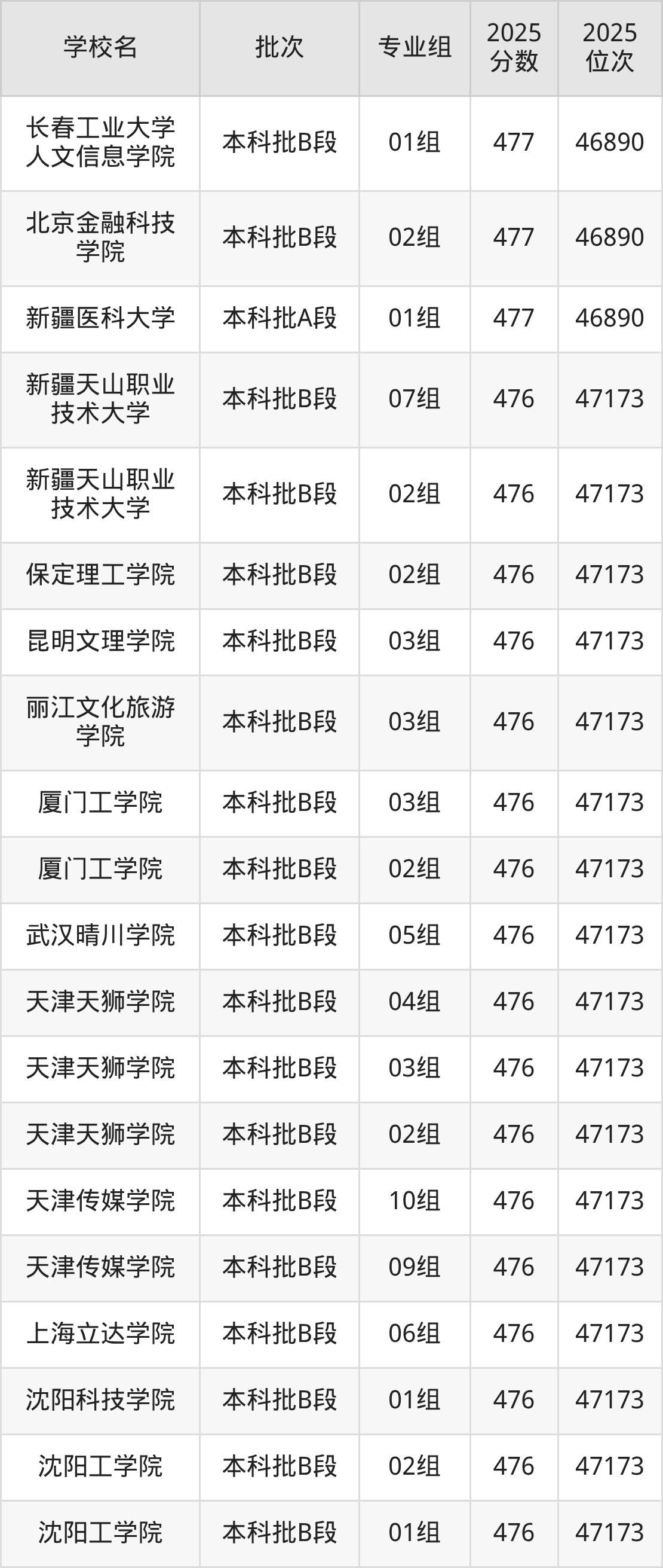 2025年天津高考476分(46891名~47173名)能上的大学有合肥城市学院02组、北京第二外国语学院中瑞酒店管理学院01组、北京金融科技学院03组、北京工业大学耿丹学院03组等。