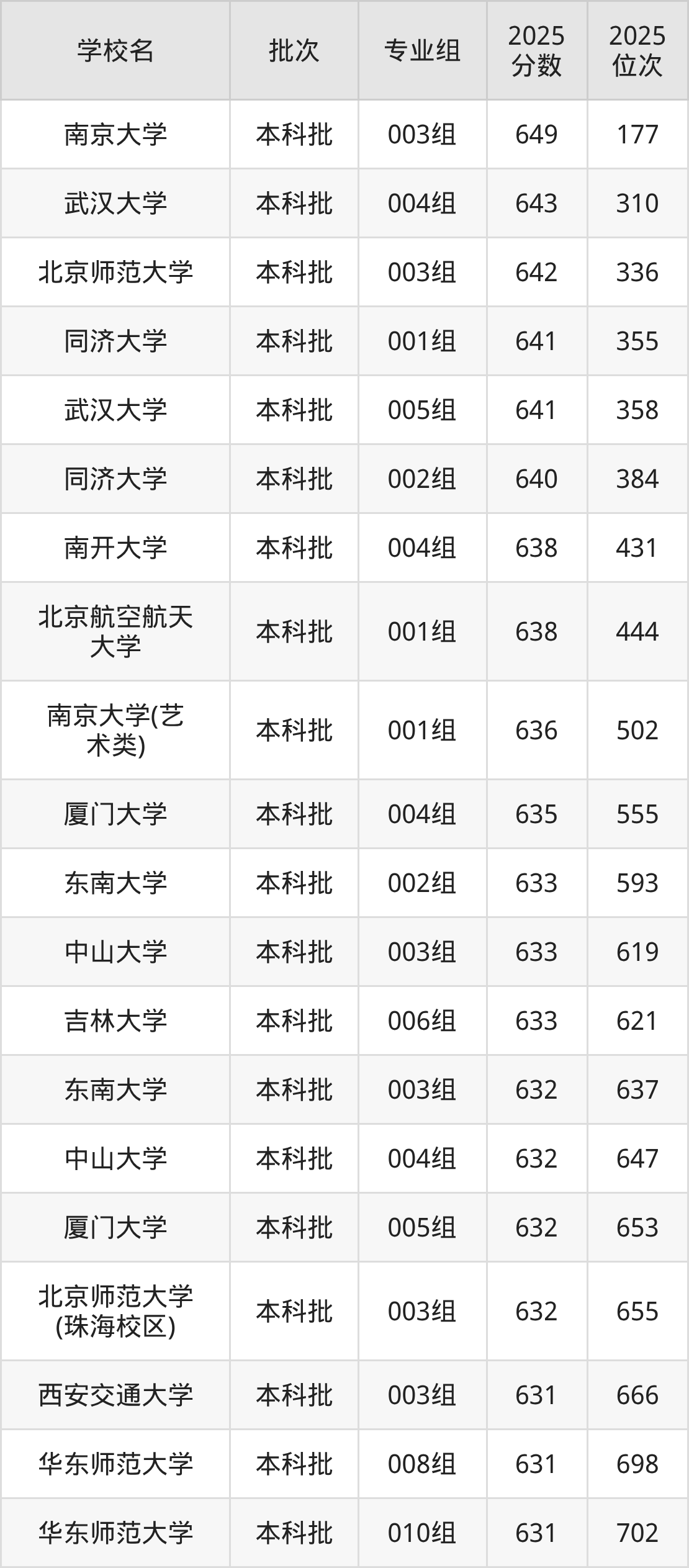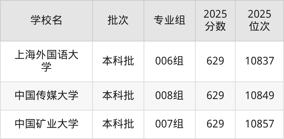 2025年安徽高考历史类631分(664名~713名)能上的大学有华东师范大学008组、华东师范大学010组、西安交通大学003组。