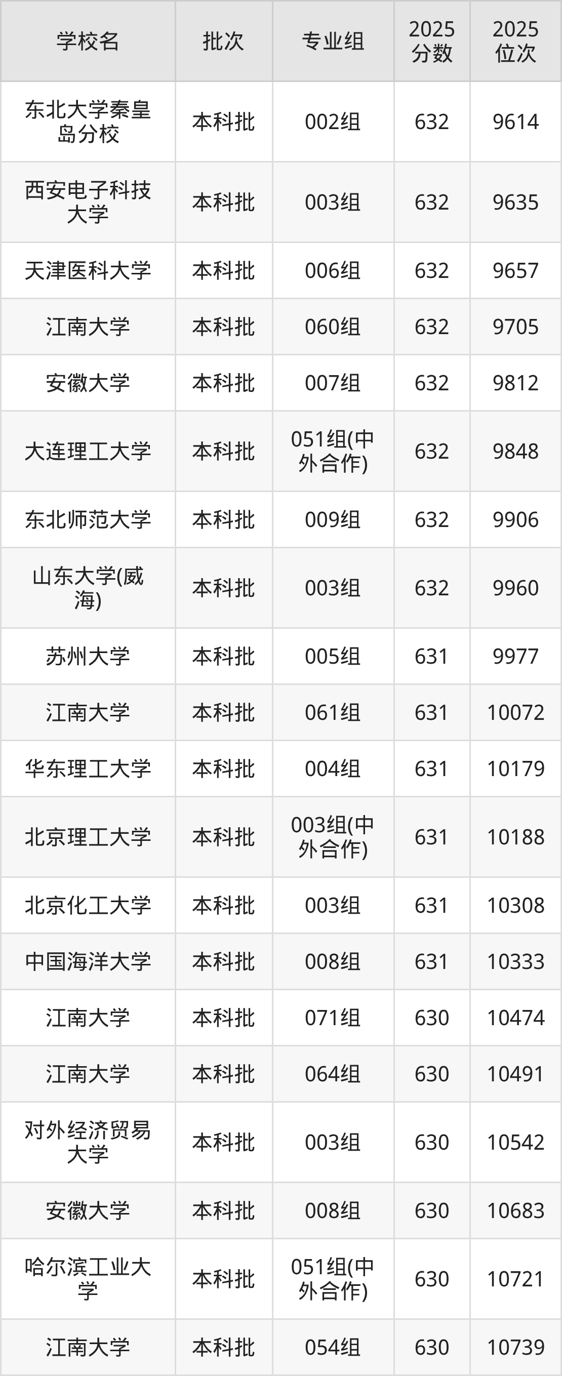 2025年安徽高考物理类631分(9967名~10374名)能上的大学有北京化工大学003组、北京理工大学003组(中外合作)、华东理工大学004组、江南大学061组等。
