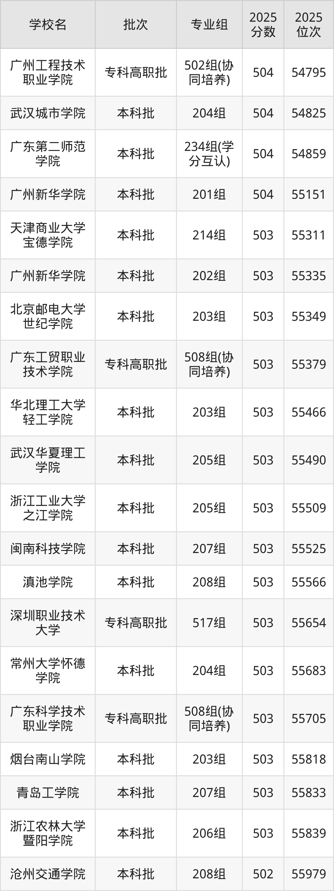 2025年广东高考历史类503分(55158名~55963名)能上的大学有烟台南山学院203组、闽南科技学院207组、浙江工业大学之江学院205组、浙江农林大学暨阳学院206组等。