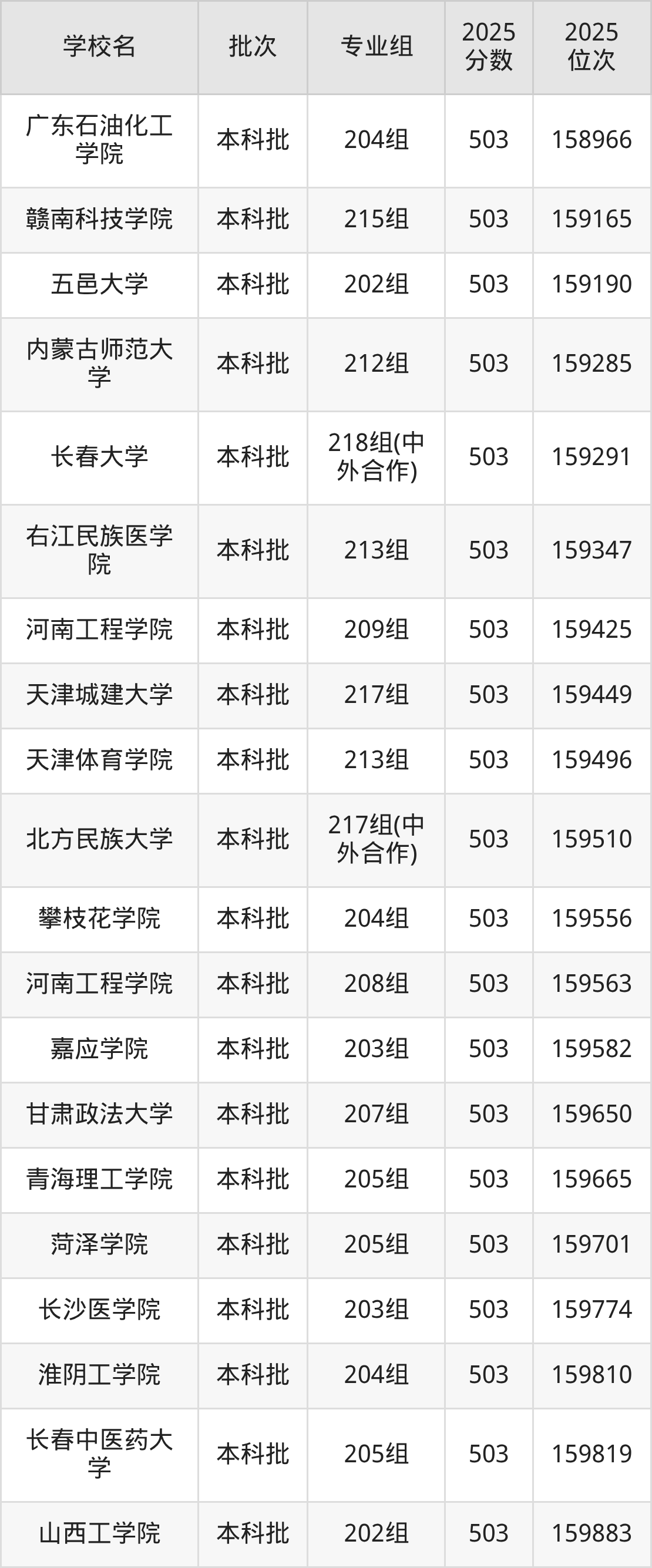2025年广东高考物理类503分(158413名~160236名)能上的大学有天津体育学院213组、内蒙古师范大学212组、长春中医药大学205组、北华大学210组等。