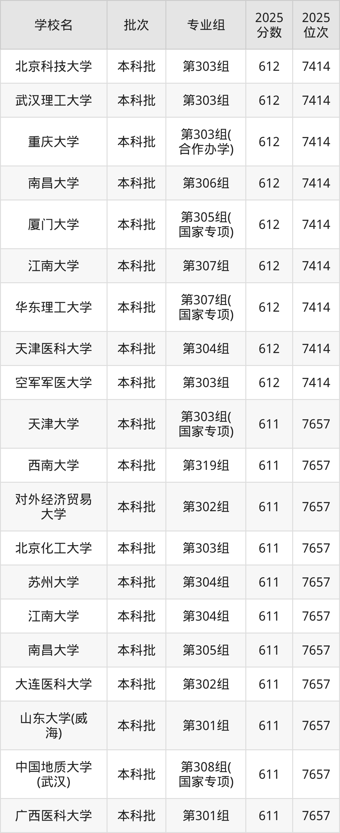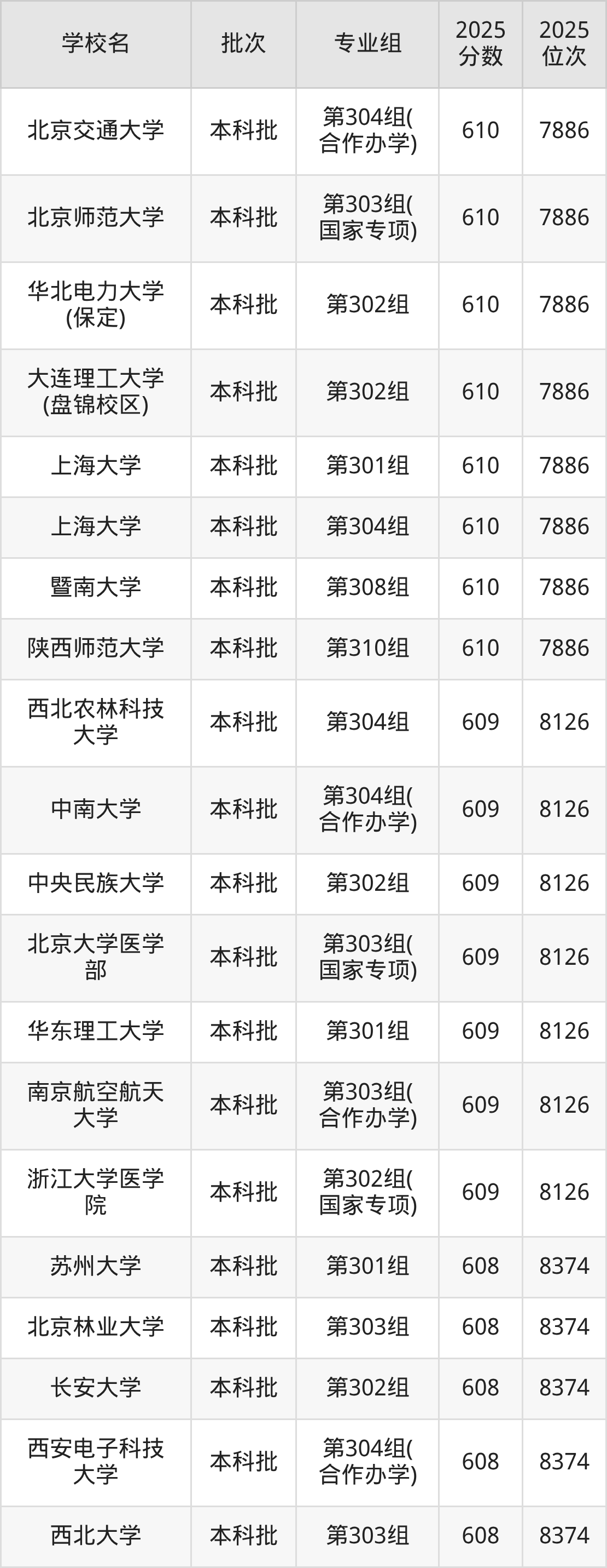 2025年山西高考物理类609分(7887名~8126名)能上的大学有中央民族大学第302组、北京大学医学部第303组(国家专项)、华东理工大学第301组、南京航空航天大学第303组(合作办学)等。