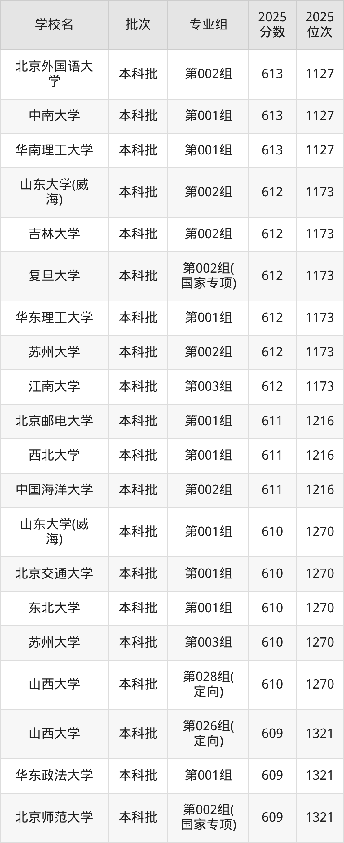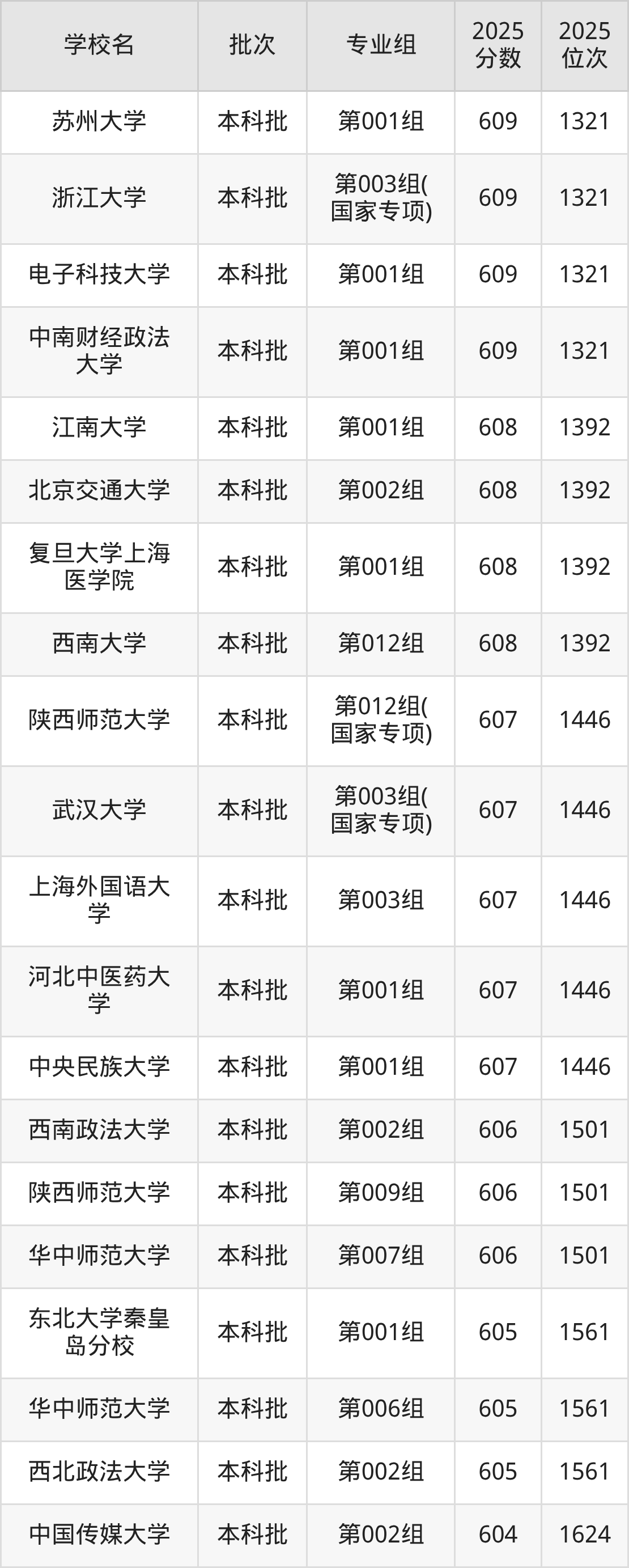 2025年山西高考历史类609分(1271名~1321名)能上的大学有北京师范大学第002组(国家专项)、华东政法大学第001组、苏州大学第001组、浙江大学第003组(国家专项)等。