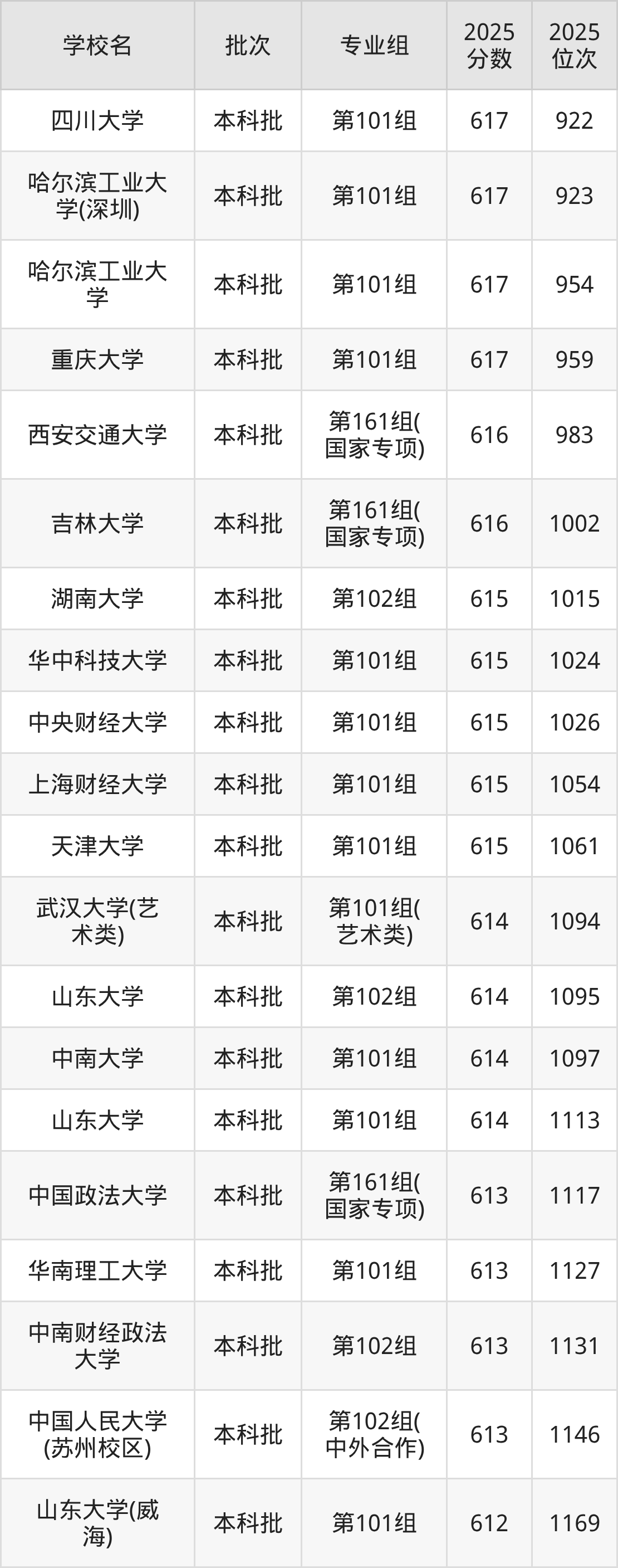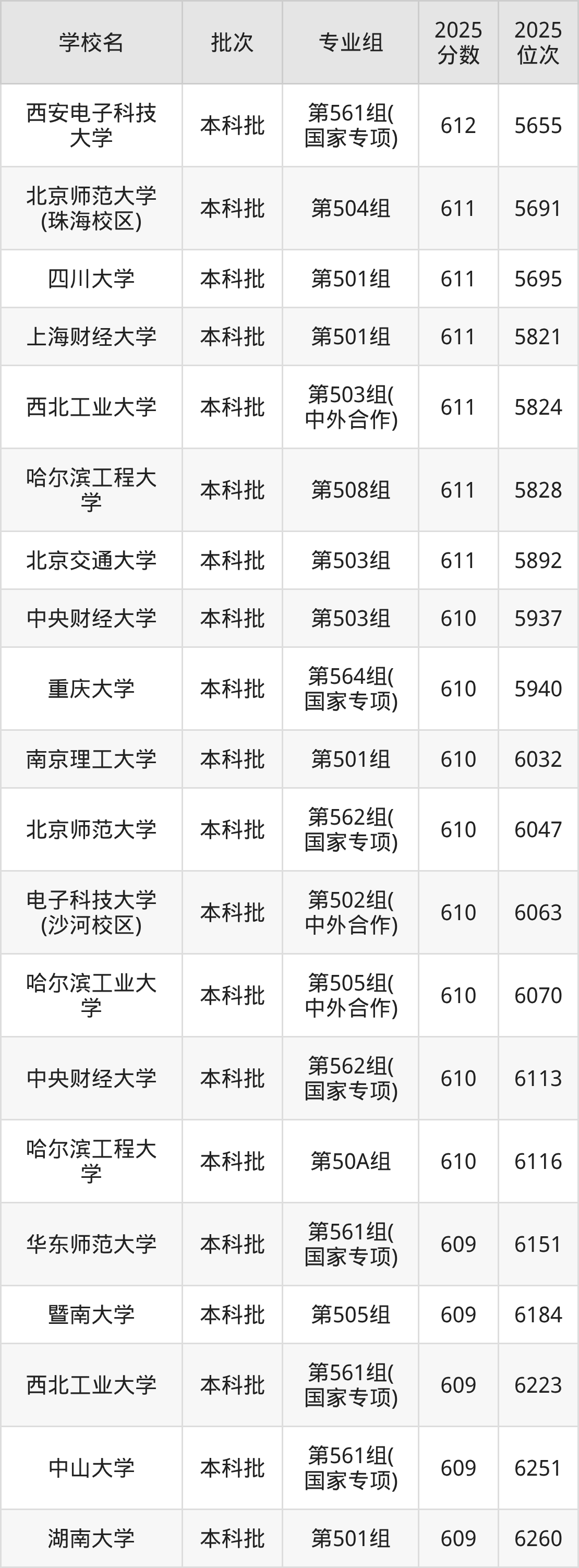 由于高考录取分数线历年波动较大,因此本文以该分数对应的位次排名为大家整理能上的大学名单。