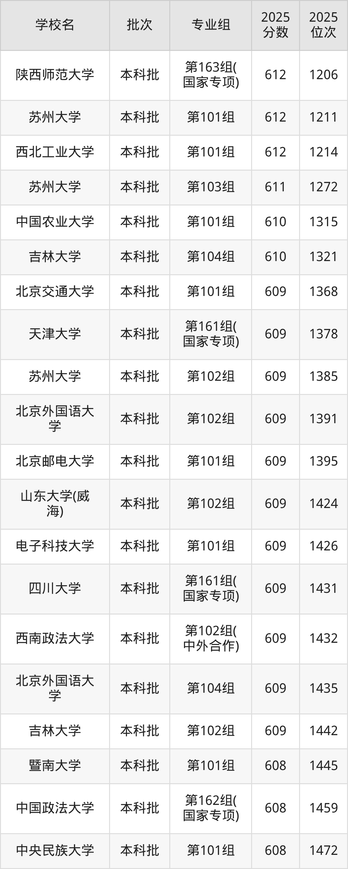 2025年江西高考历史类609分(1365名~1443名)能上的大学有北京交通大学第101组、北京邮电大学第101组、北京外国语大学第102组、北京外国语大学第104组等。