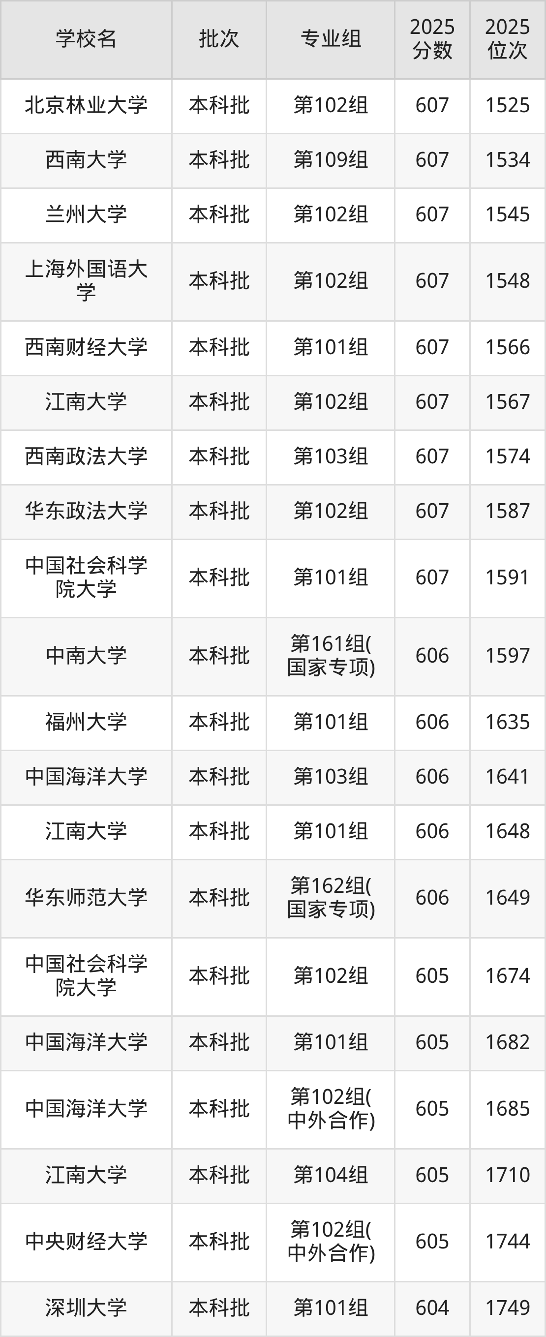 另外录取位次低于该区间(较稳妥)的有暨南大学第101组(1445名)、中国政法大学第162组(国家专项)(1459名)等;录取位次高于该区间(可冲)的有吉林大学第104组(1321名)、中国农业大学第101组(1315名)等。