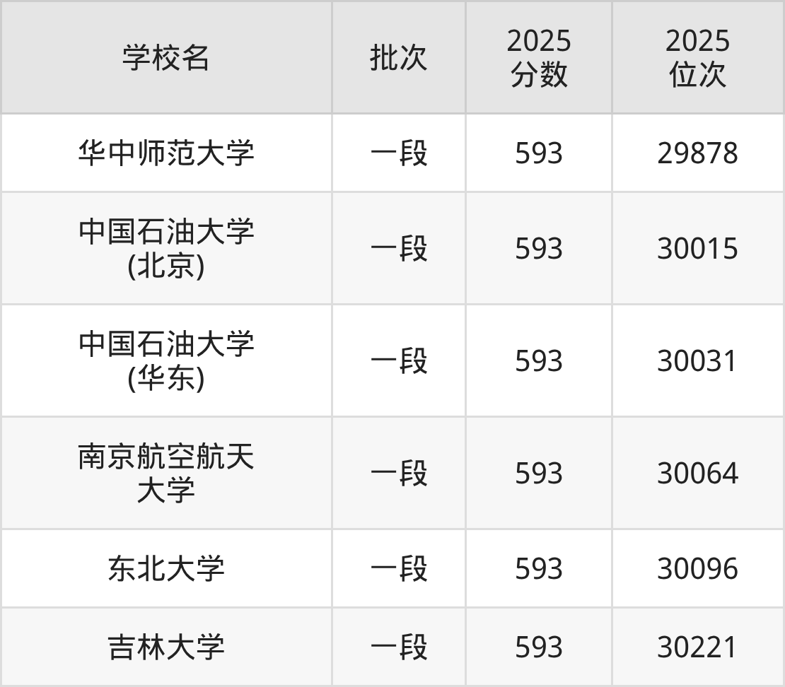 2025年山东高考593分(29550名~30395名)能上的大学有华中师范大学、南京航空航天大学、中国石油大学(北京)、中国石油大学(华东)等。