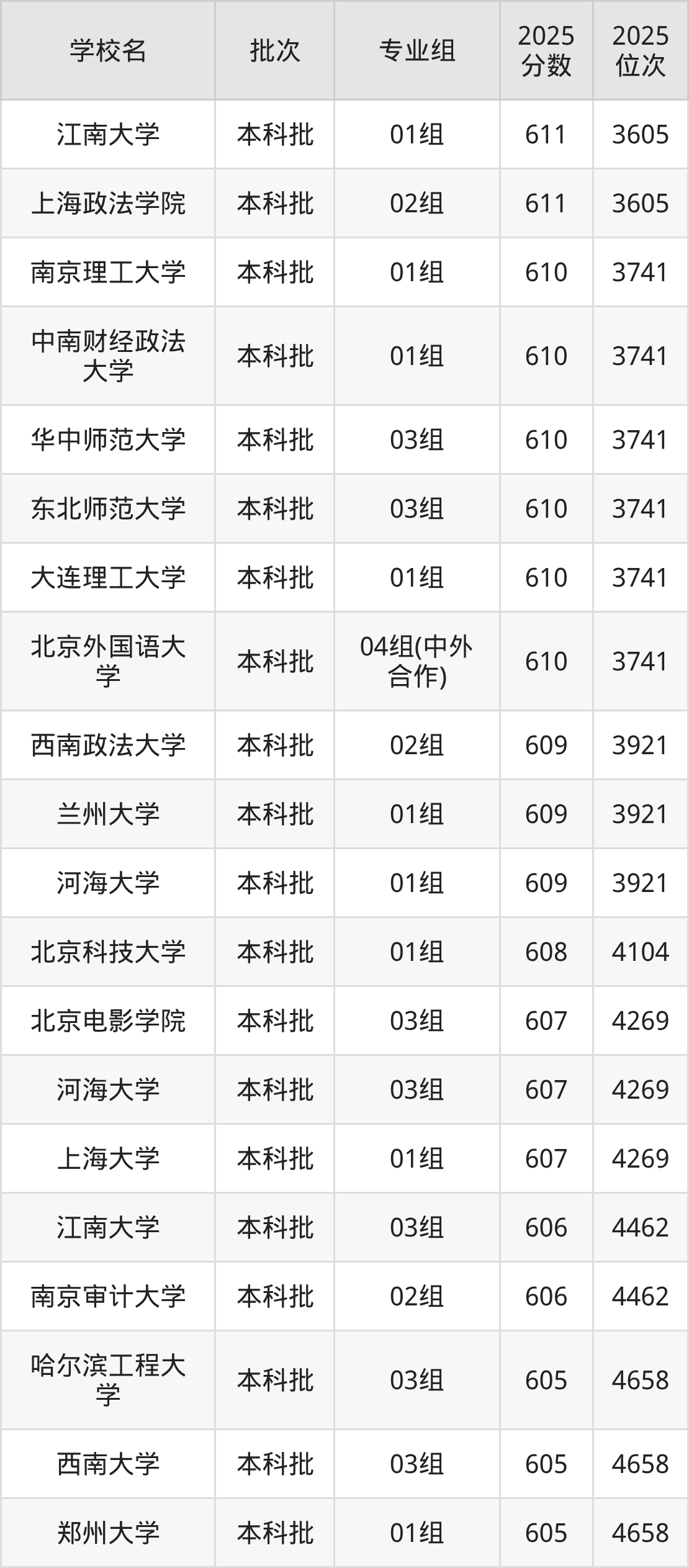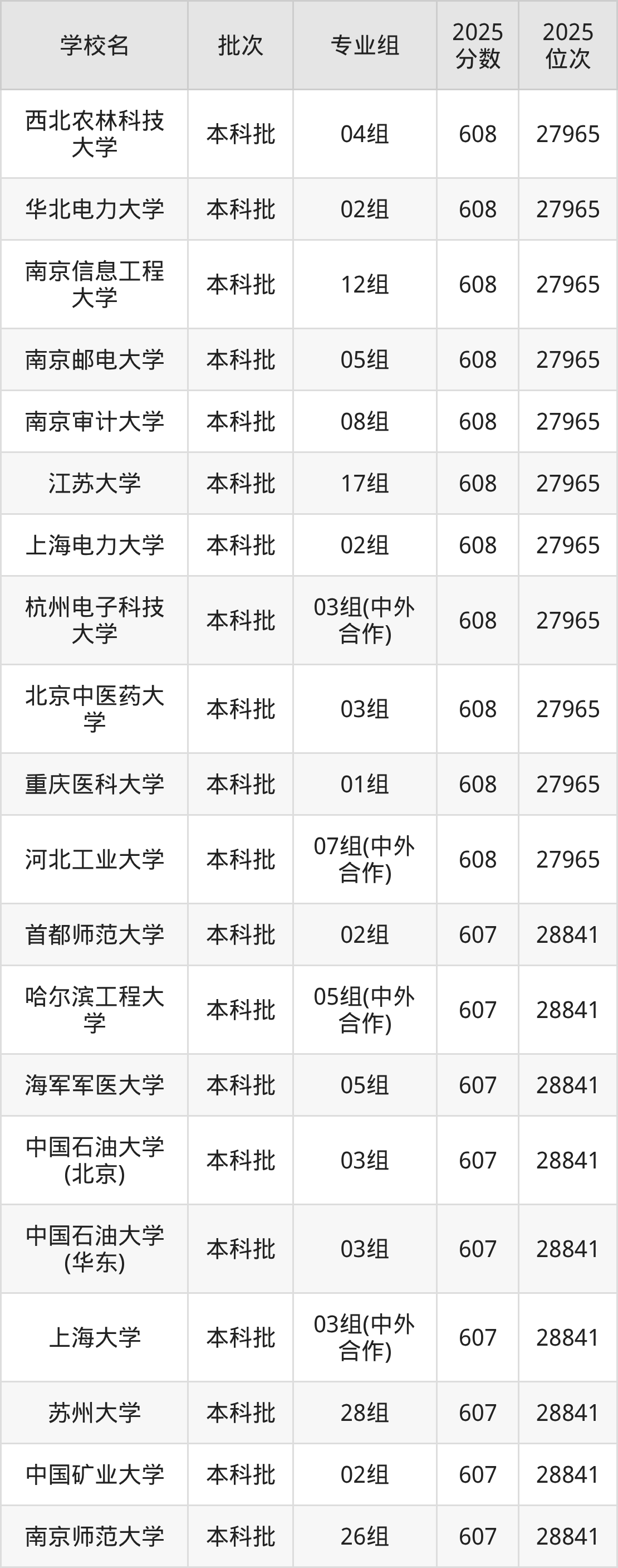 2025年江苏高考历史类607分(4105名~4269名)能上的大学有河海大学03组、上海大学01组、北京电影学院03组。