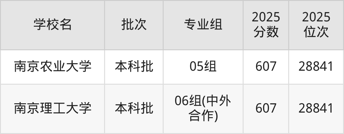 2025年江苏高考物理类607分(27966名~28841名)能上的大学有海军军医大学05组、南京理工大学06组(中外合作)、南京农业大学05组、南京师范大学26组等。