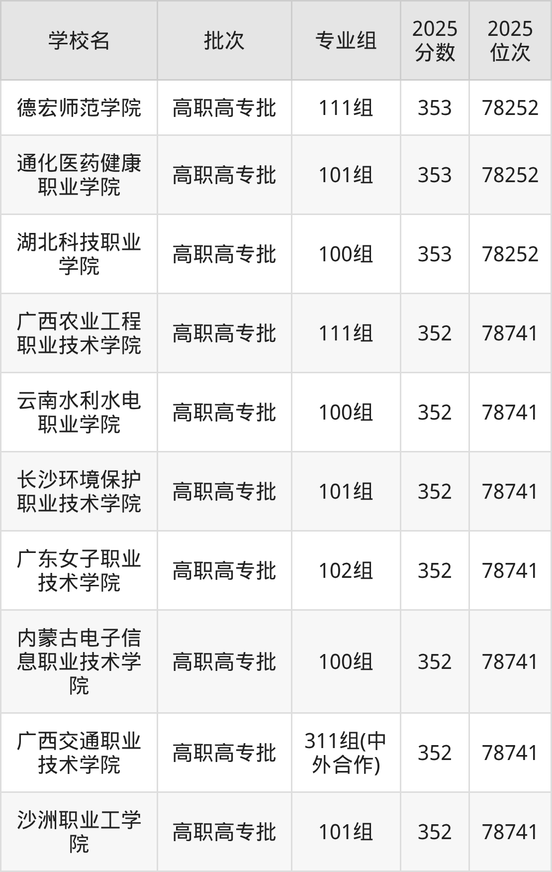 2025年广西高考历史类352分(78253名~78741名)能上的大学有沙洲职业工学院101组、广西交通职业技术学院311组(中外合作)、内蒙古电子信息职业技术学院100组、广东女子职业技术学院102组等。