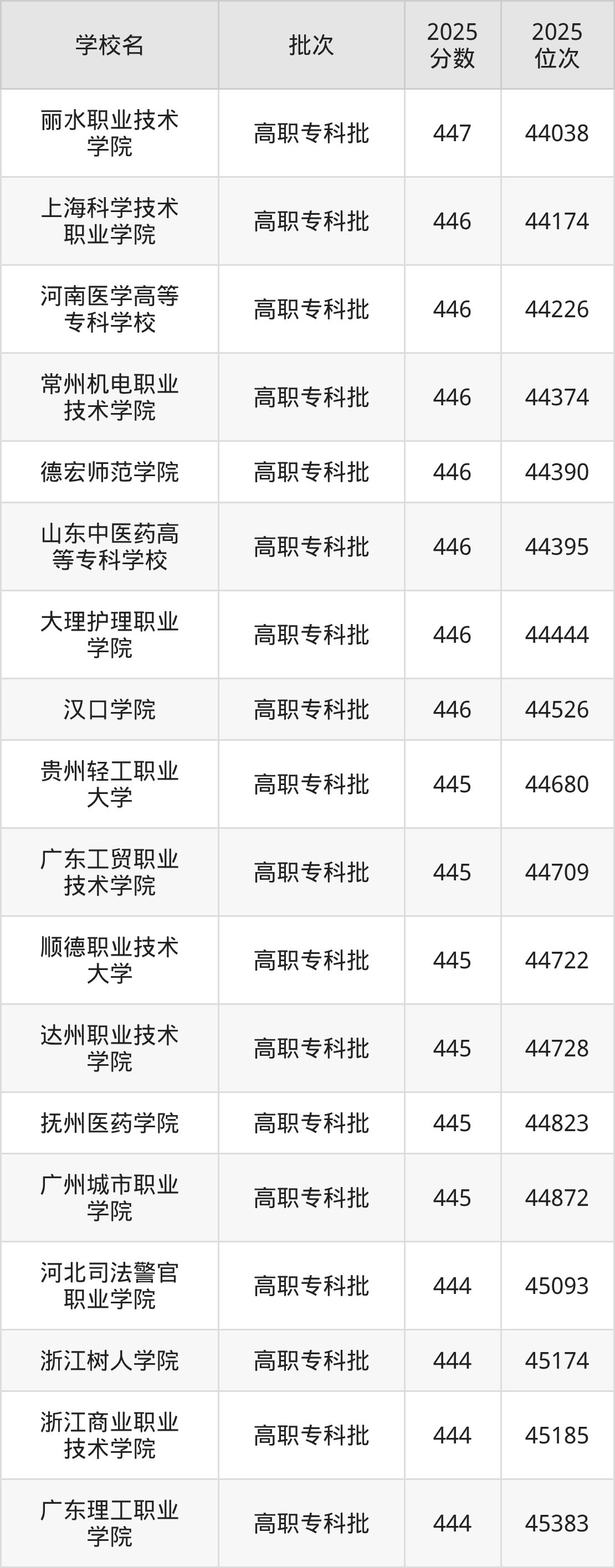 2025年贵州高考历史类445分(44527名~44980名)能上的大学有广东工贸职业技术学院、广州城市职业学院、抚州医药学院、达州职业技术学院等。