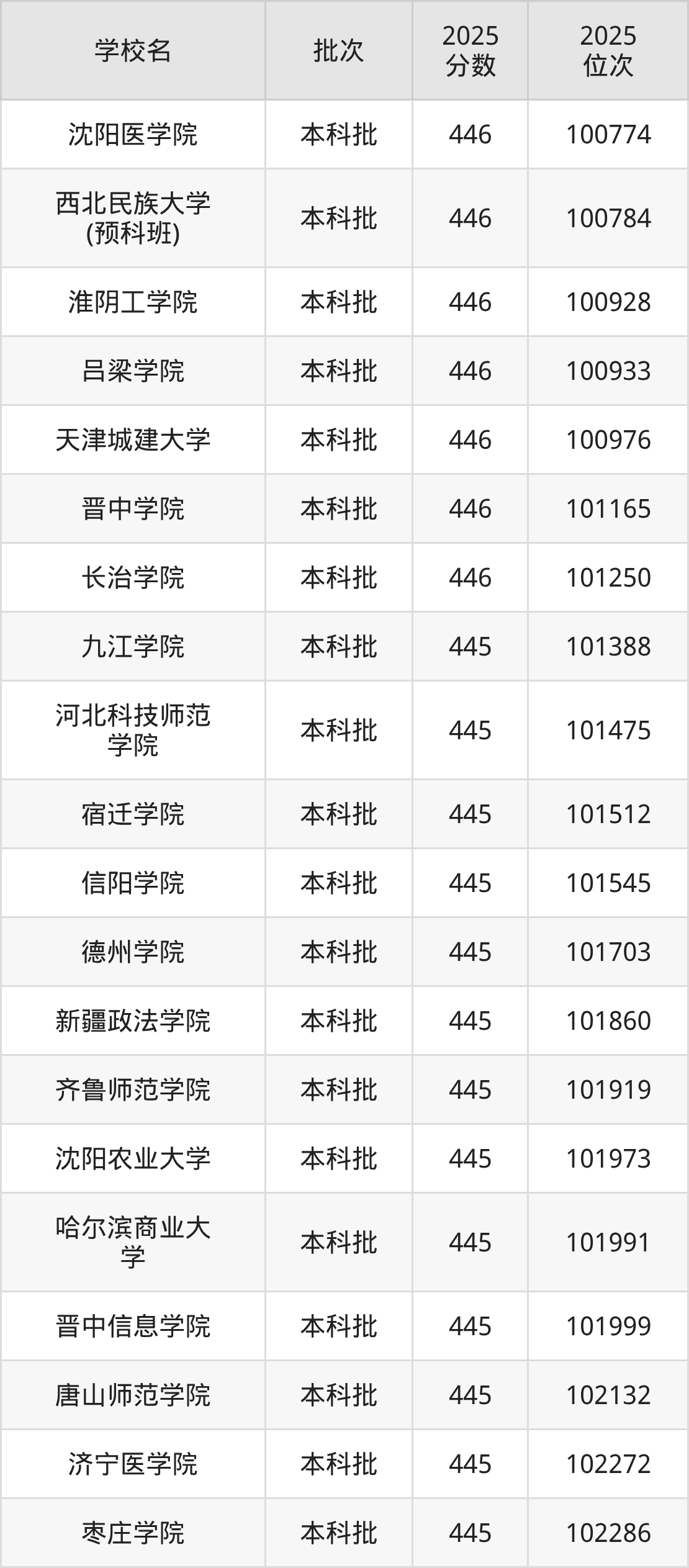 2025年贵州高考物理类445分(101254名~102305名)能上的大学有枣庄学院、沈阳农业大学、齐鲁师范学院、哈尔滨商业大学等。