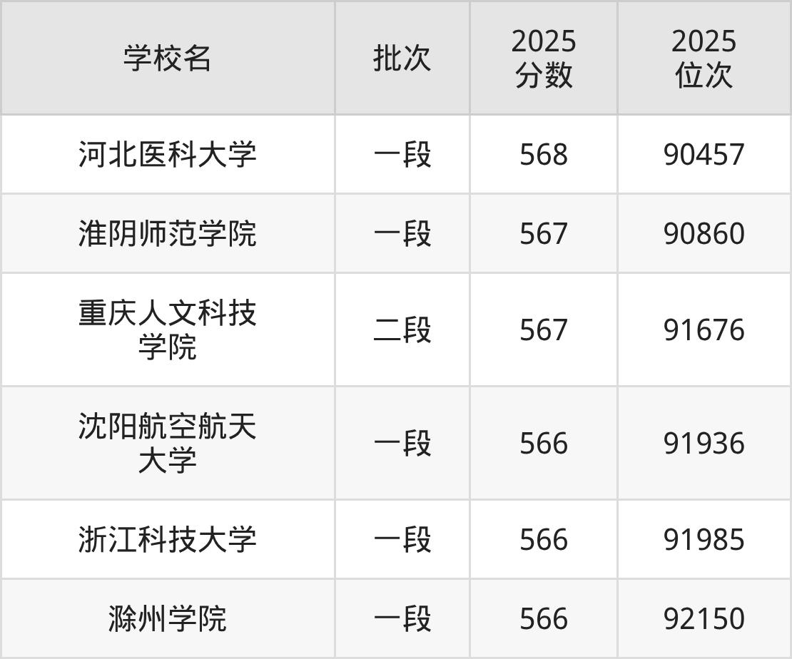 这些都是2026年高考90632名~91868名考生可以报考的大学,更多学校名单如下表所示: