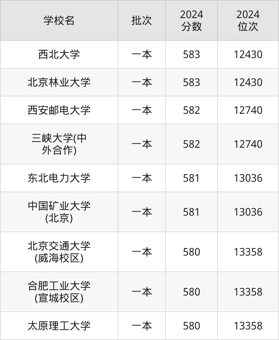 2024年云南高考理科581分(12741名~13036名)能上的大学有东北电力大学、中国矿业大学(北京)。