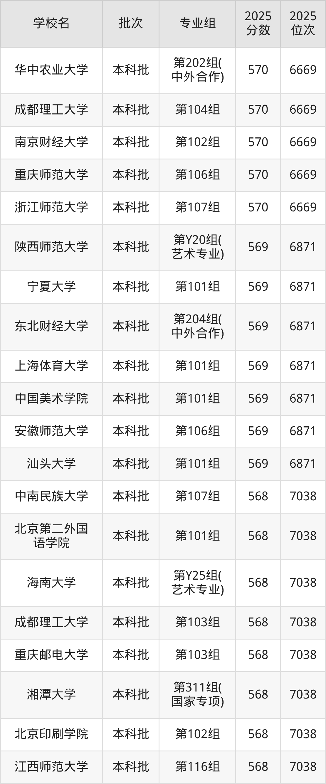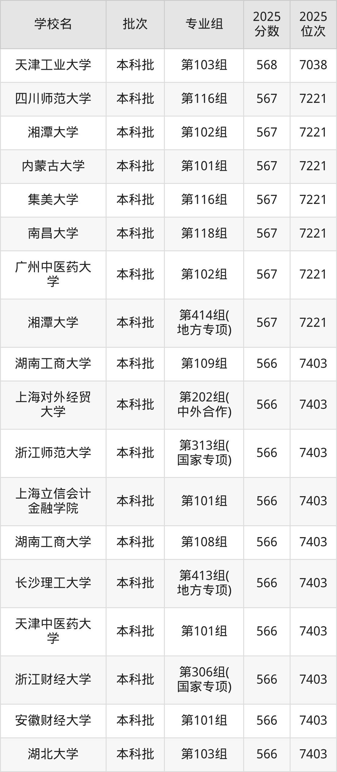 2025年湖南高考历史类568分(6872名~7038名)能上的大学有北京第二外国语学院第101组、北京印刷学院第102组、天津工业大学第103组、江西师范大学第116组等。