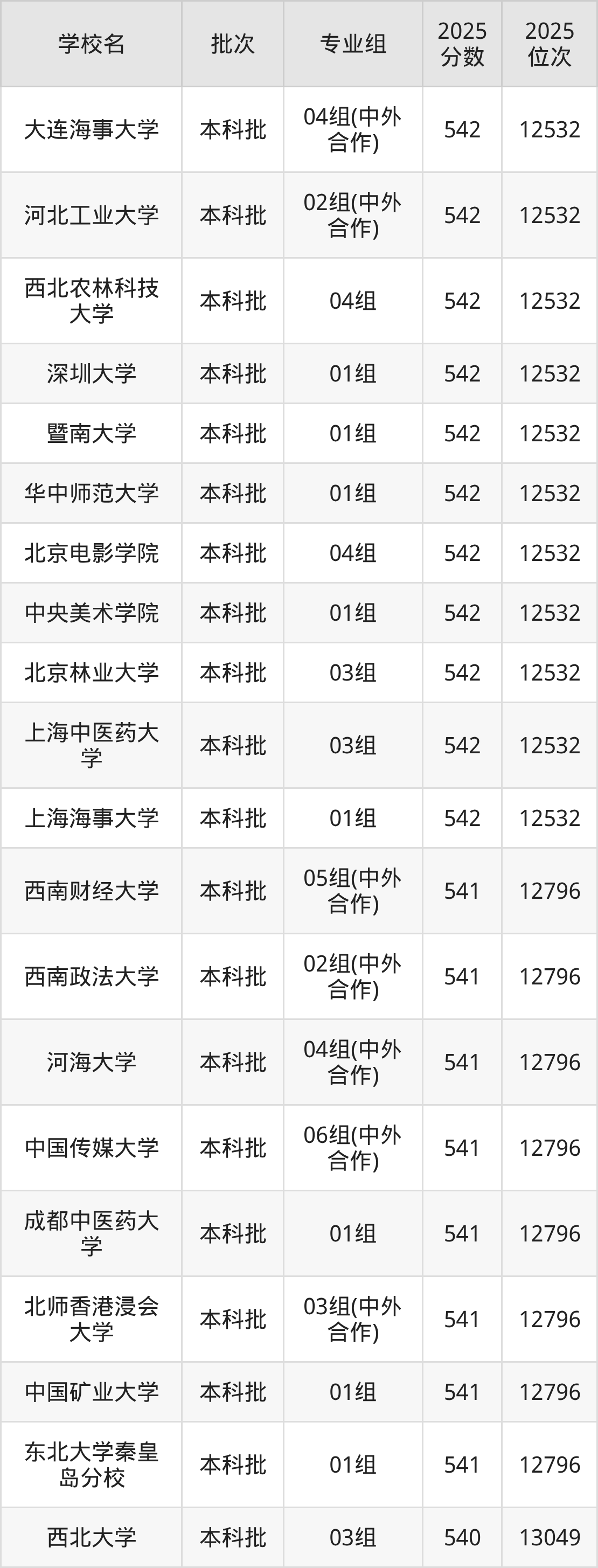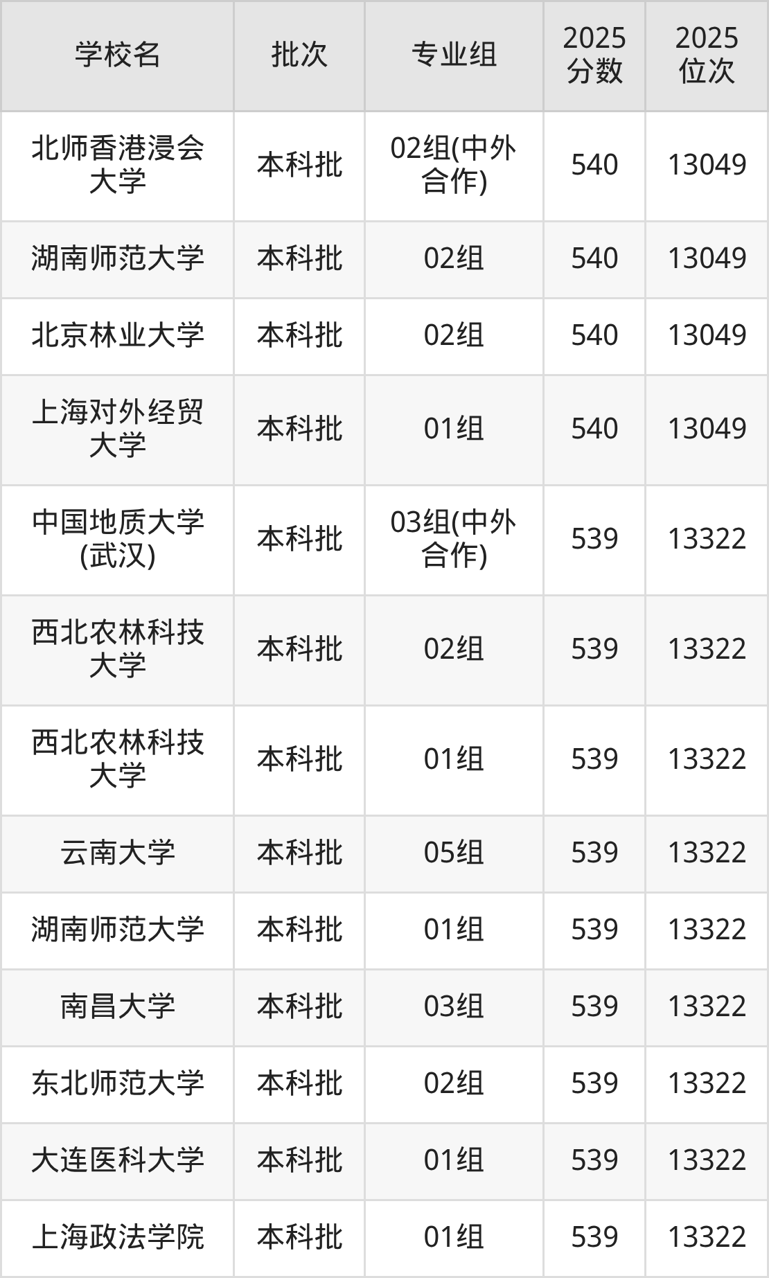 2025年上海高考540分(12797名~13049名)能上的大学有上海对外经贸大学01组、北京林业大学02组、湖南师范大学02组、北师香港浸会大学02组(中外合作)等。