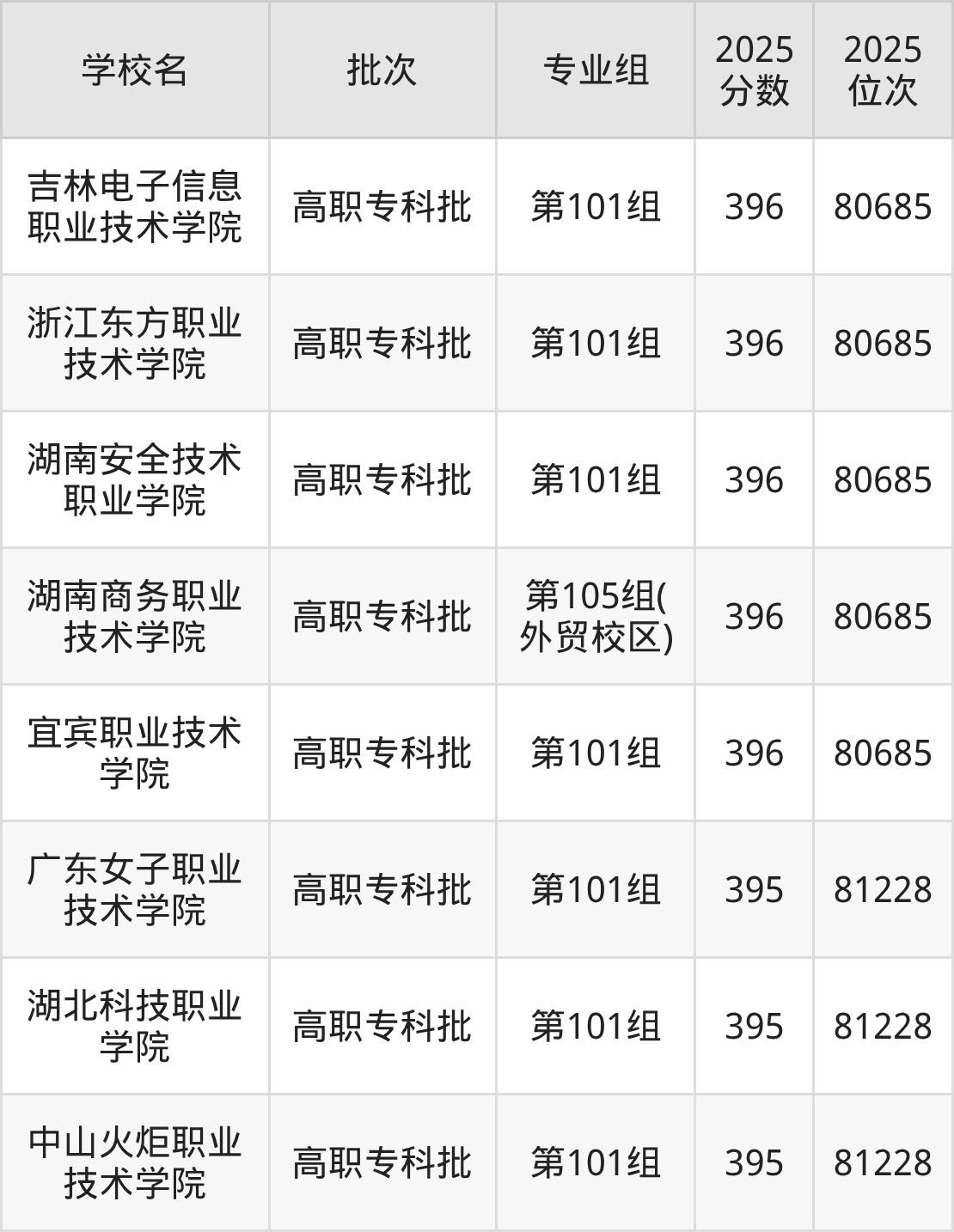 2025年湖南高考历史类395分(80686名~81228名)能上的大学有湖北科技职业学院第101组、广东女子职业技术学院第101组、中山火炬职业技术学院第101组。