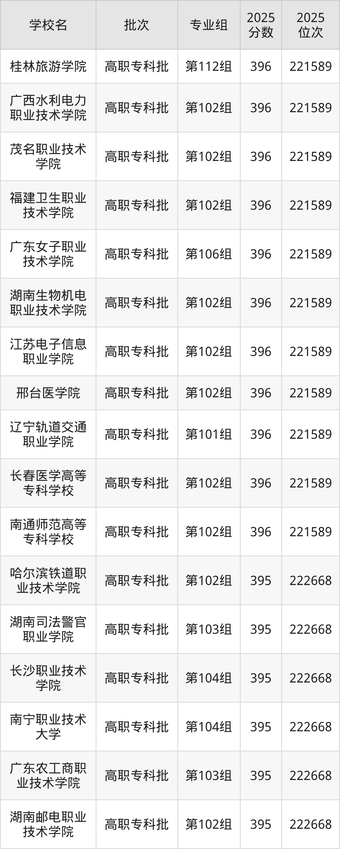 2025年湖南高考物理类395分(221590名~222668名)能上的大学有哈尔滨铁道职业技术学院第102组、湖南邮电职业技术学院第102组、广东农工商职业技术学院第103组、南宁职业技术大学第104组等。