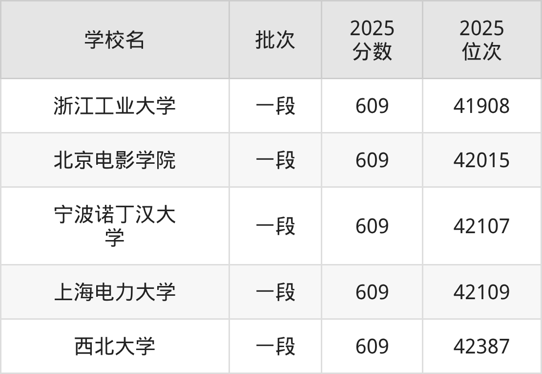 2025年浙江高考609分(41843名~42849名)能上的大学有上海电力大学、西北大学、浙江工业大学、宁波诺丁汉大学等。