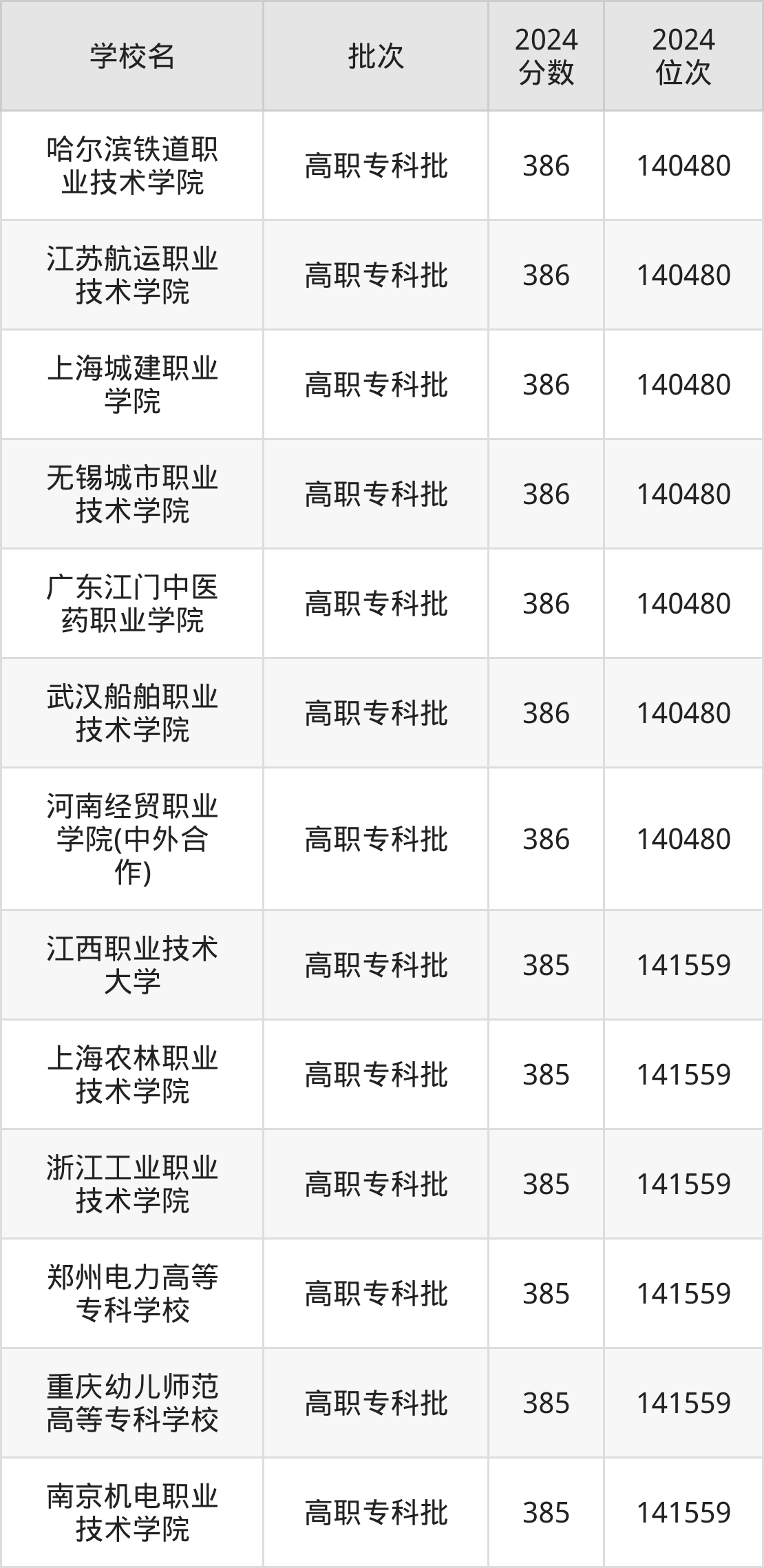 2024年河南高考文科385分(140481名~141559名)能上的大学有上海农林职业技术学院、南京机电职业技术学院、重庆幼儿师范高等专科学校、江西职业技术大学等。