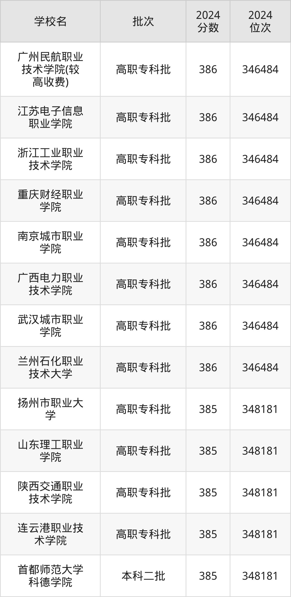 2024年河南高考理科385分(346486名~348182名)能上的大学有首都师范大学科德学院、连云港职业技术学院、陕西交通职业技术学院、山东理工职业学院等。