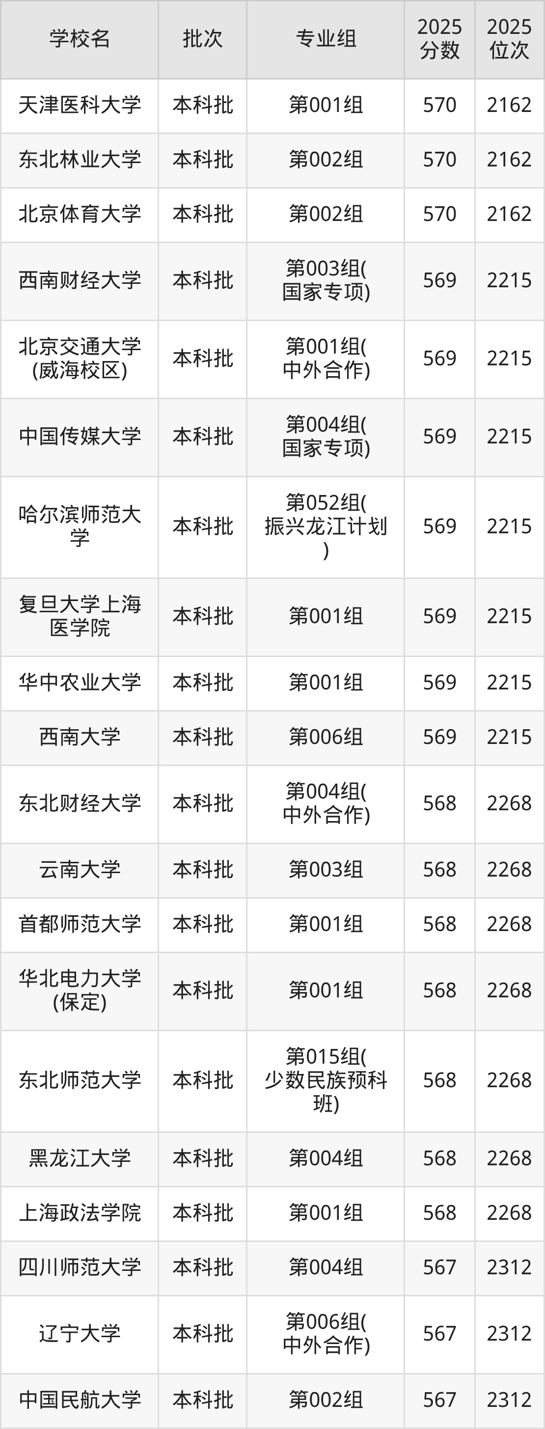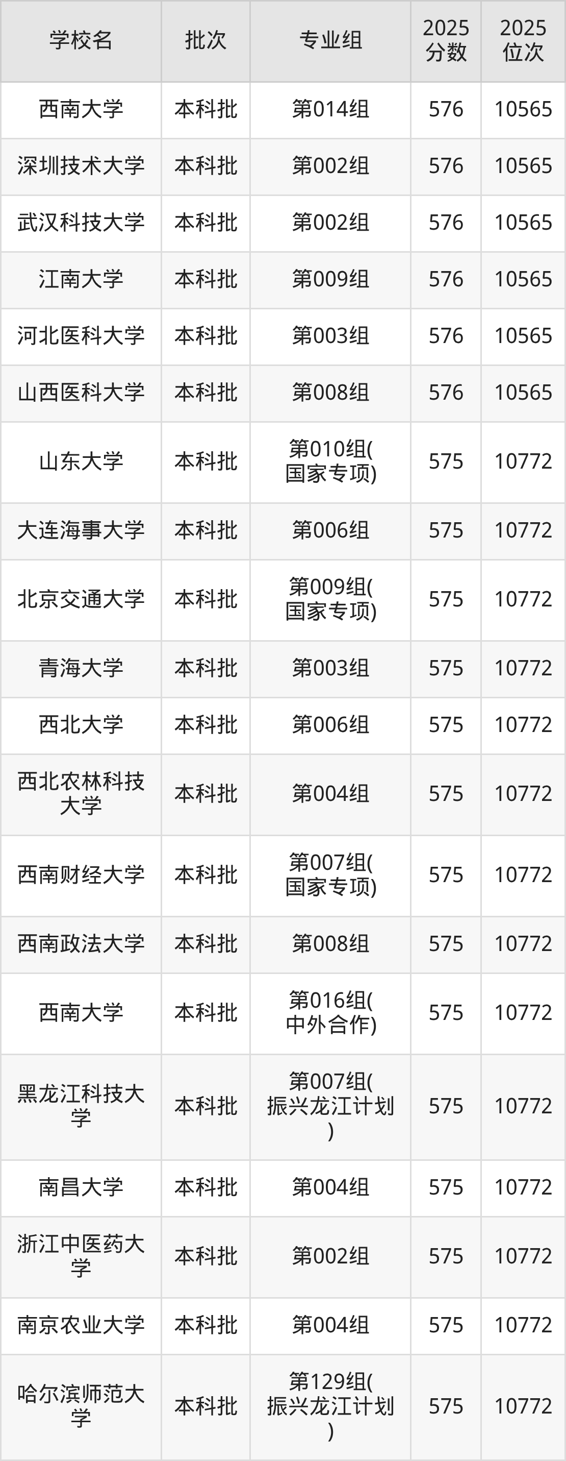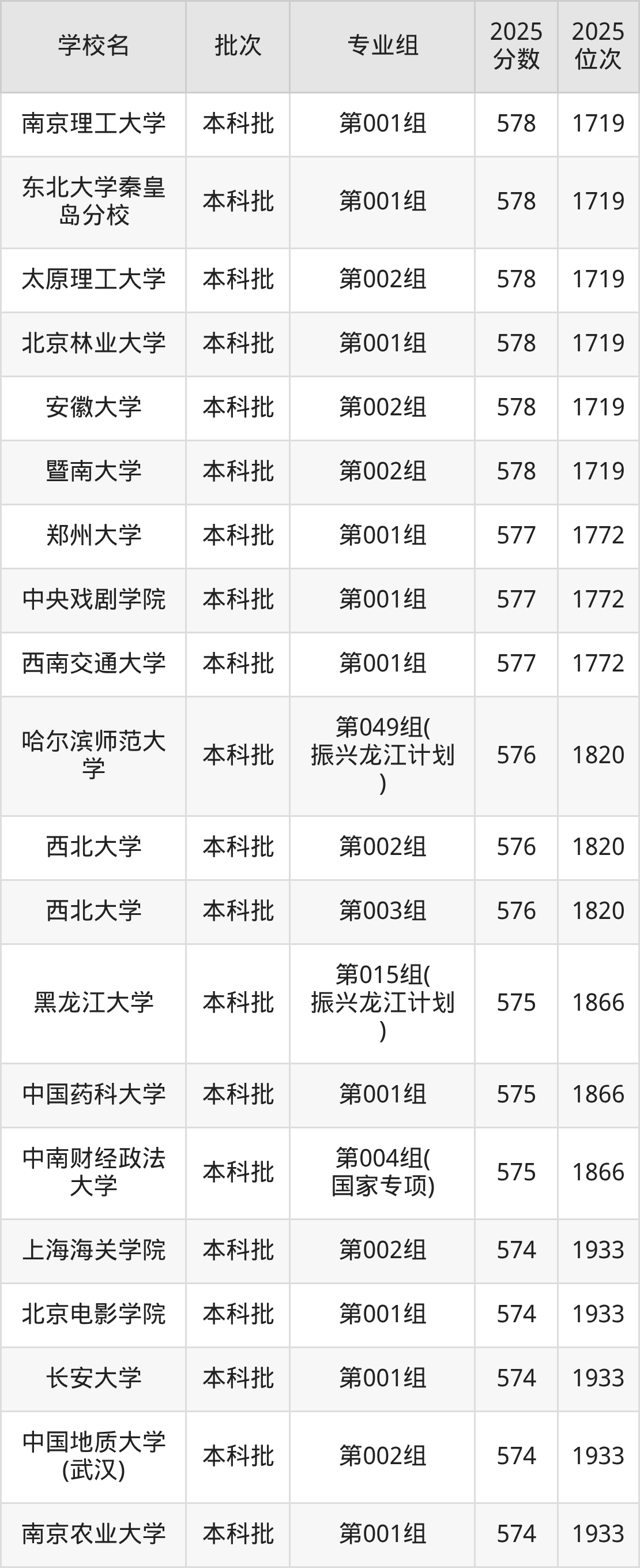 2025年黑龙江高考历史类575分(1821名~1866名)能上的大学有黑龙江大学第015组(振兴龙江计划)、中国药科大学第001组、中南财经政法大学第004组(国家专项)。