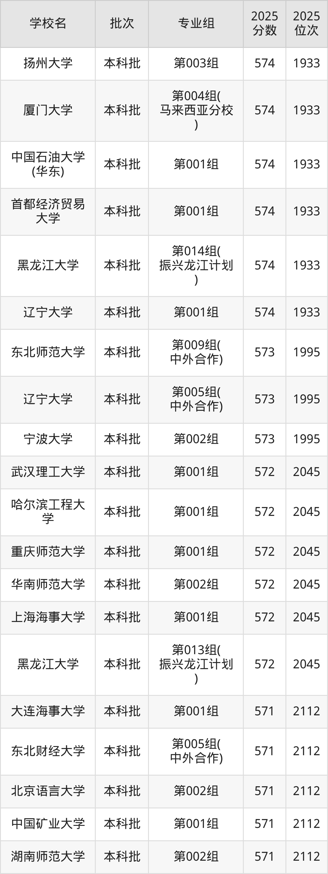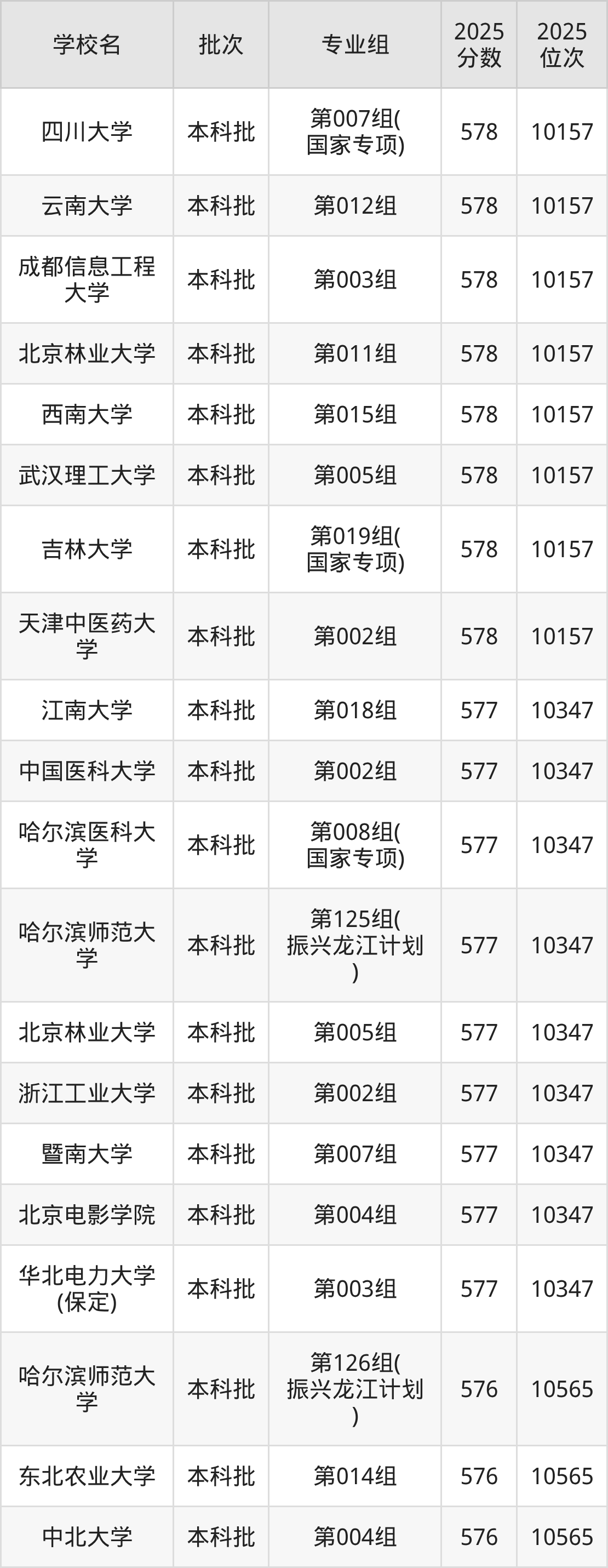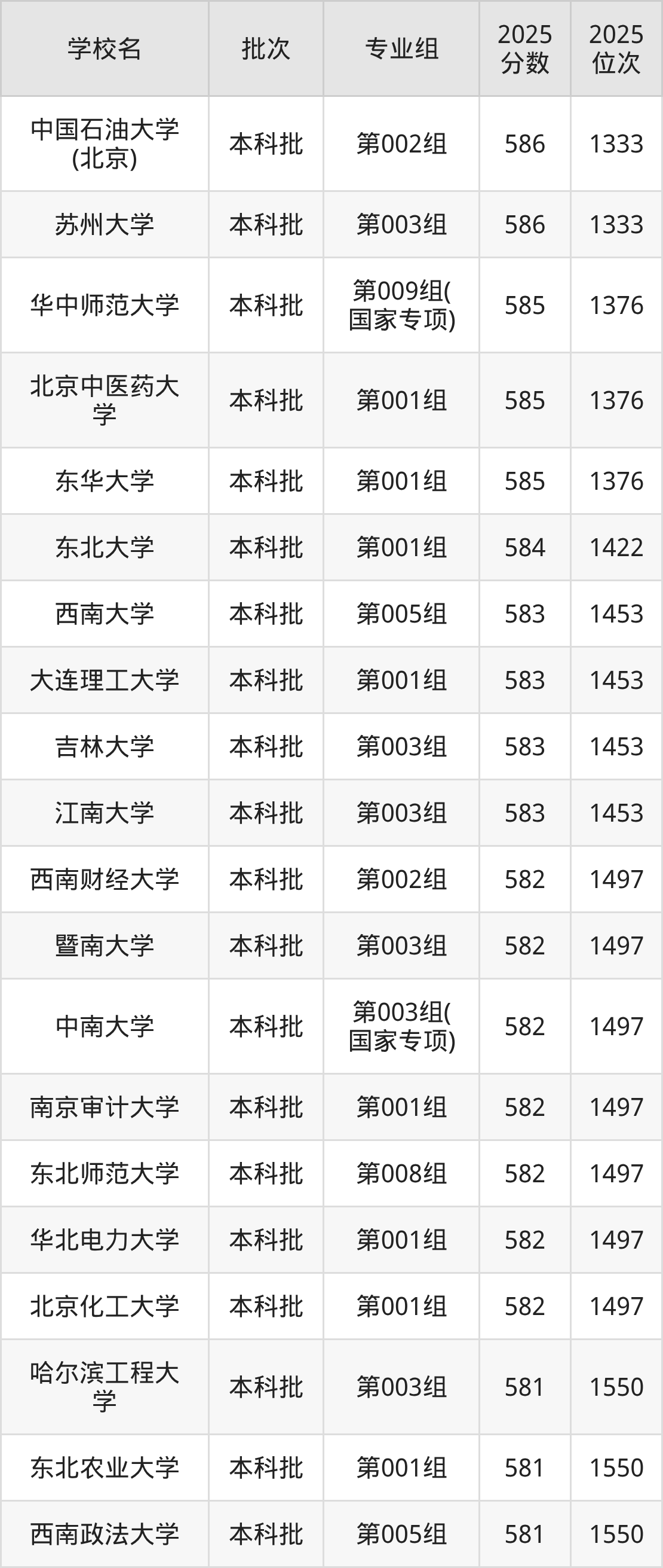2025年黑龙江高考历史类575分(1821名~1866名)能上的大学有黑龙江大学第015组(振兴龙江计划)、中国药科大学第001组、中南财经政法大学第004组(国家专项)。