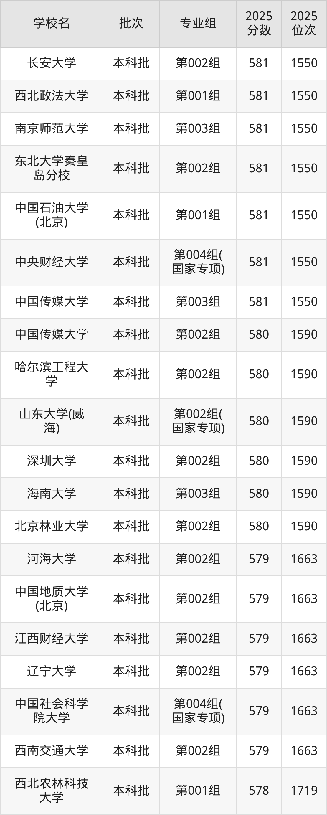 由于高考录取分数线历年波动较大,因此本文以该分数对应的位次排名为大家整理能上的大学名单。