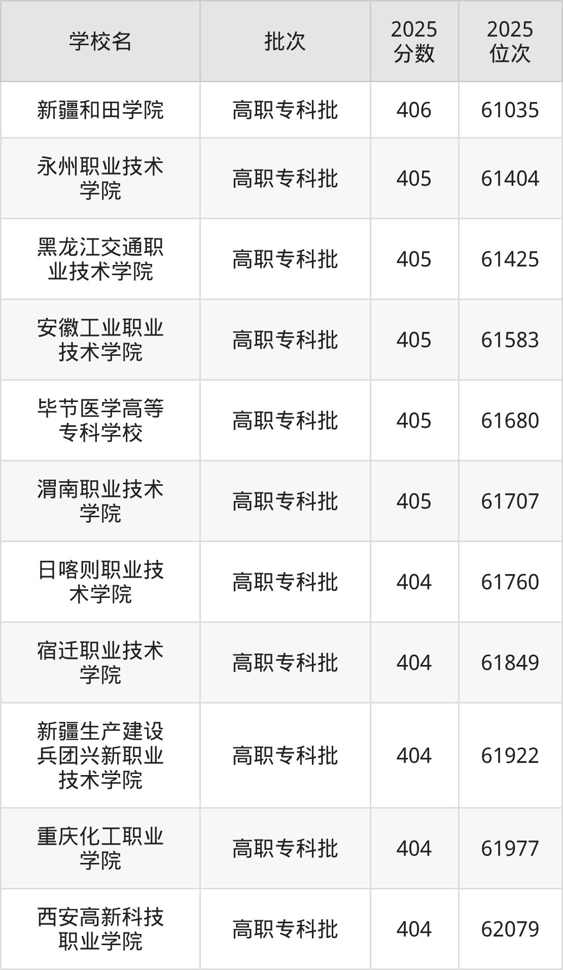 2025年贵州高考历史类405分(61380名~61752名)能上的大学有永州职业技术学院、毕节医学高等专科学校、安徽工业职业技术学院、黑龙江交通职业技术学院等。