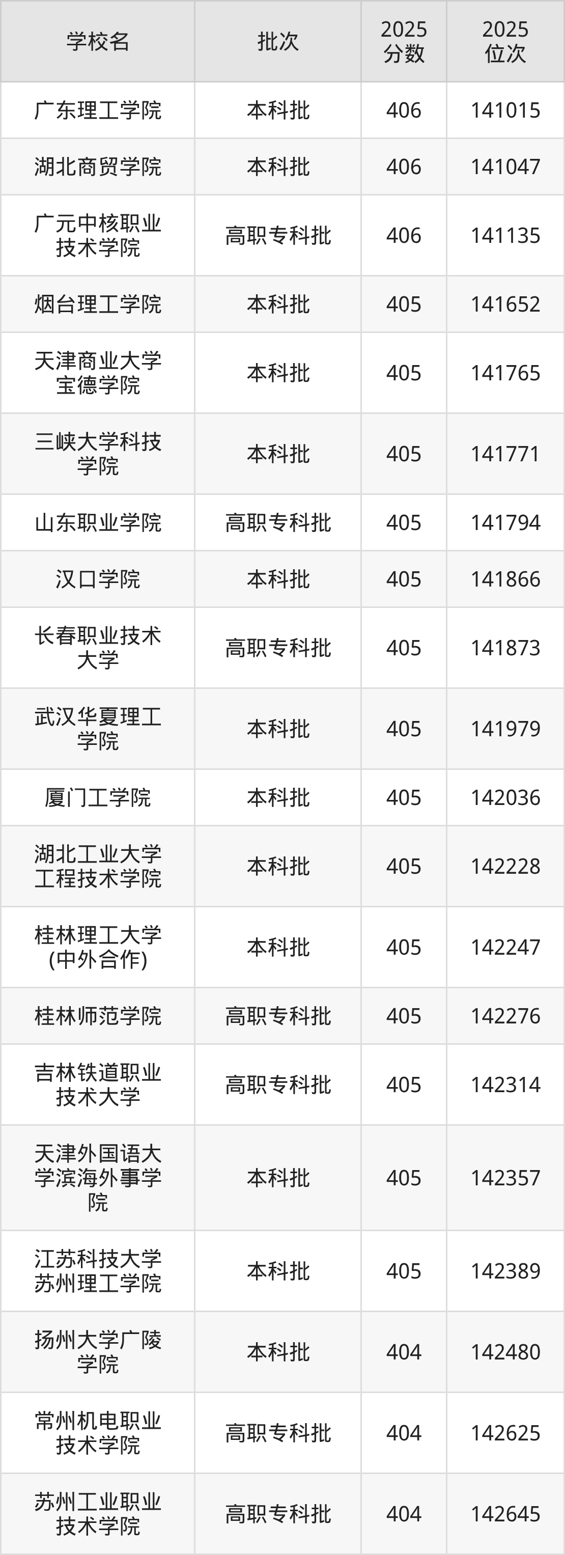 2025年贵州高考物理类405分(141513名~142447名)能上的大学有长春职业技术大学、烟台理工学院、山东职业学院、三峡大学科技学院等。
