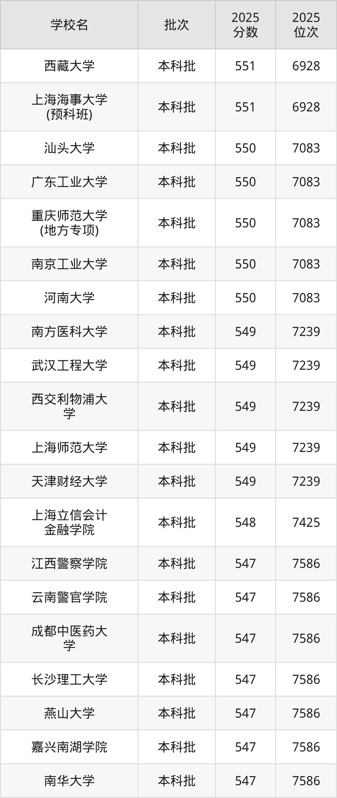 2025年重庆高考历史类547分(7426名~7586名)能上的大学有嘉兴南湖学院、燕山大学、长沙理工大学、成都中医药大学等。