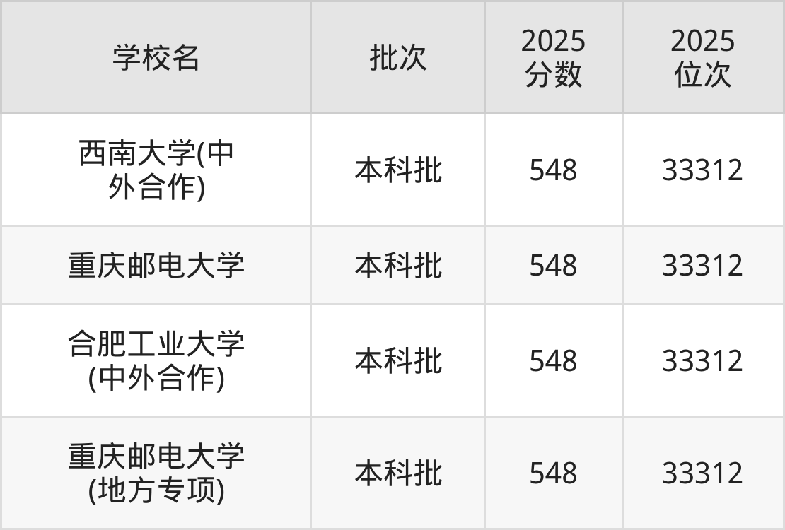 2025年重庆高考物理类547分(33313名~33846名)录取位次低于该区间(较稳妥)的有浙江财经大学(34376名)、宁夏大学(34376名)等;录取位次高于该区间(可冲)的有重庆邮电大学(33312名)、合肥工业大学(中外合作)(33312名)等。