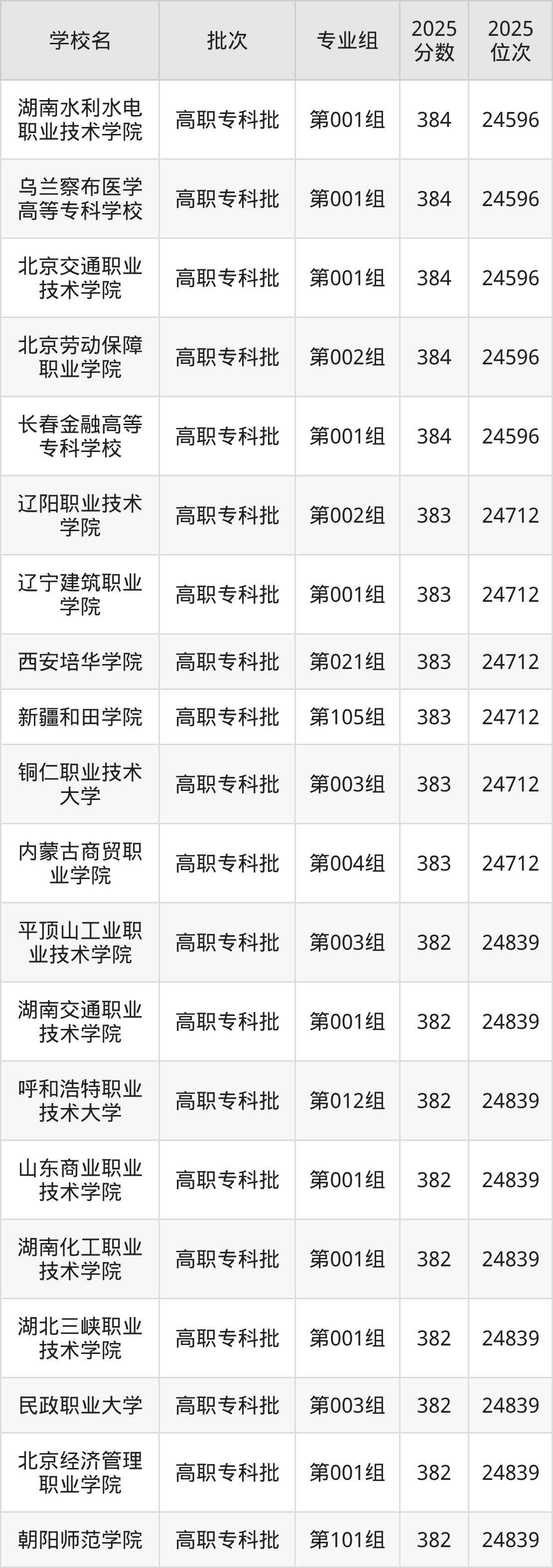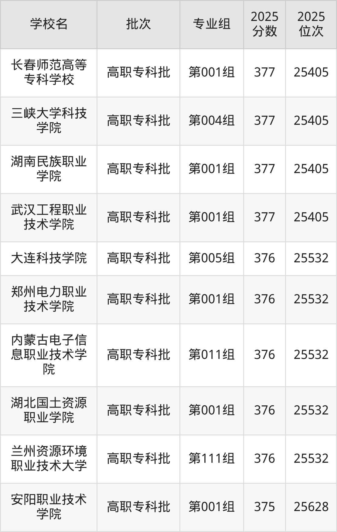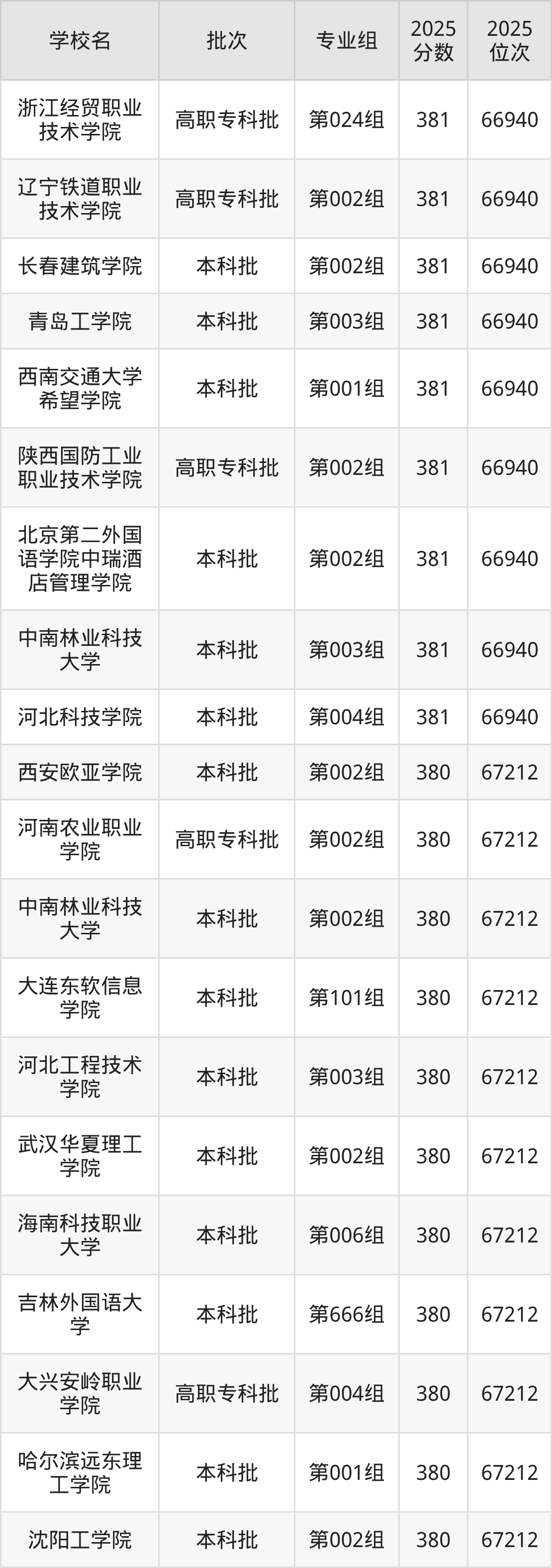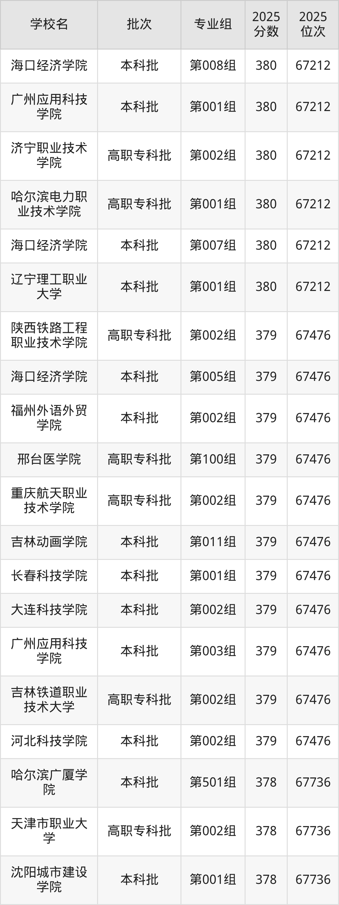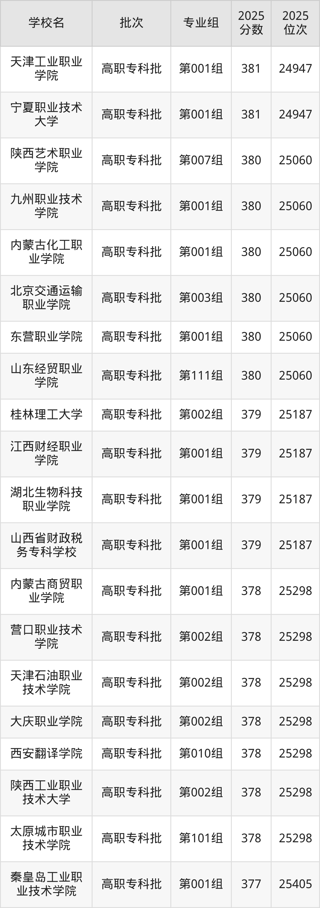 2025年内蒙古高考历史类379分(25061名~25187名)能上的大学有桂林理工大学第002组、江西财经职业学院第001组、湖北生物科技职业学院第001组、山西省财政税务专科学校第001组。