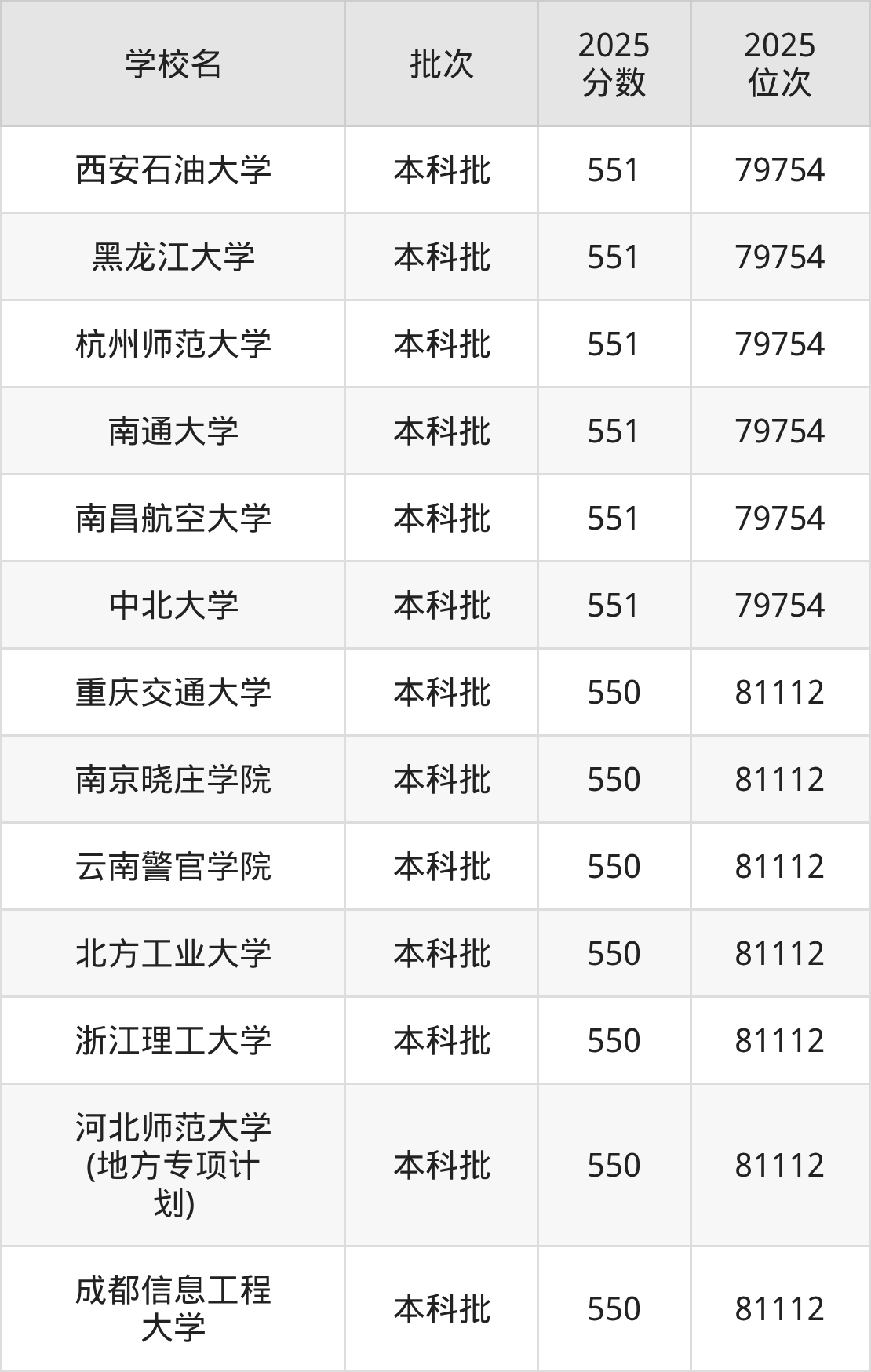 2025年河北高考物理类550分(79755名~81112名)能上的大学有成都信息工程大学、重庆交通大学、河北师范大学(地方专项计划)、浙江理工大学等。
