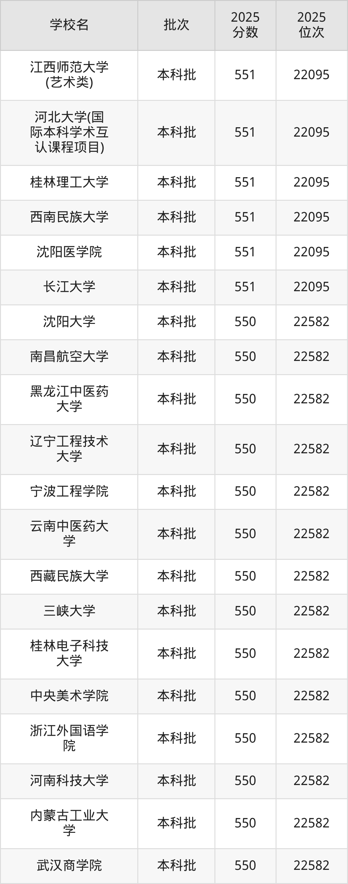 2025年河北高考历史类550分(22096名~22582名)能上的大学有浙江外国语学院、河南科技大学、内蒙古工业大学、沈阳大学等。