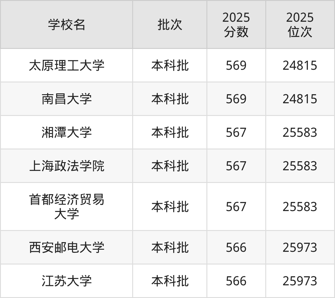 2025年辽宁高考物理类567分(25205名~25583名)能上的大学有湘潭大学、上海政法学院、首都经济贸易大学。