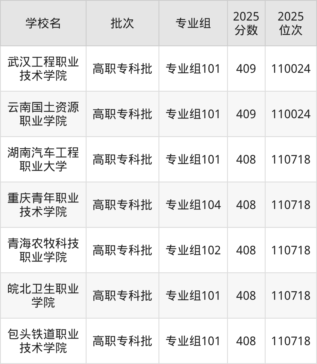 2025年四川高考历史类408分(110025名~110718名)能上的大学有包头铁道职业技术学院专业组101、皖北卫生职业学院专业组101、青海农牧科技职业学院专业组102、湖南汽车工程职业大学专业组101等。