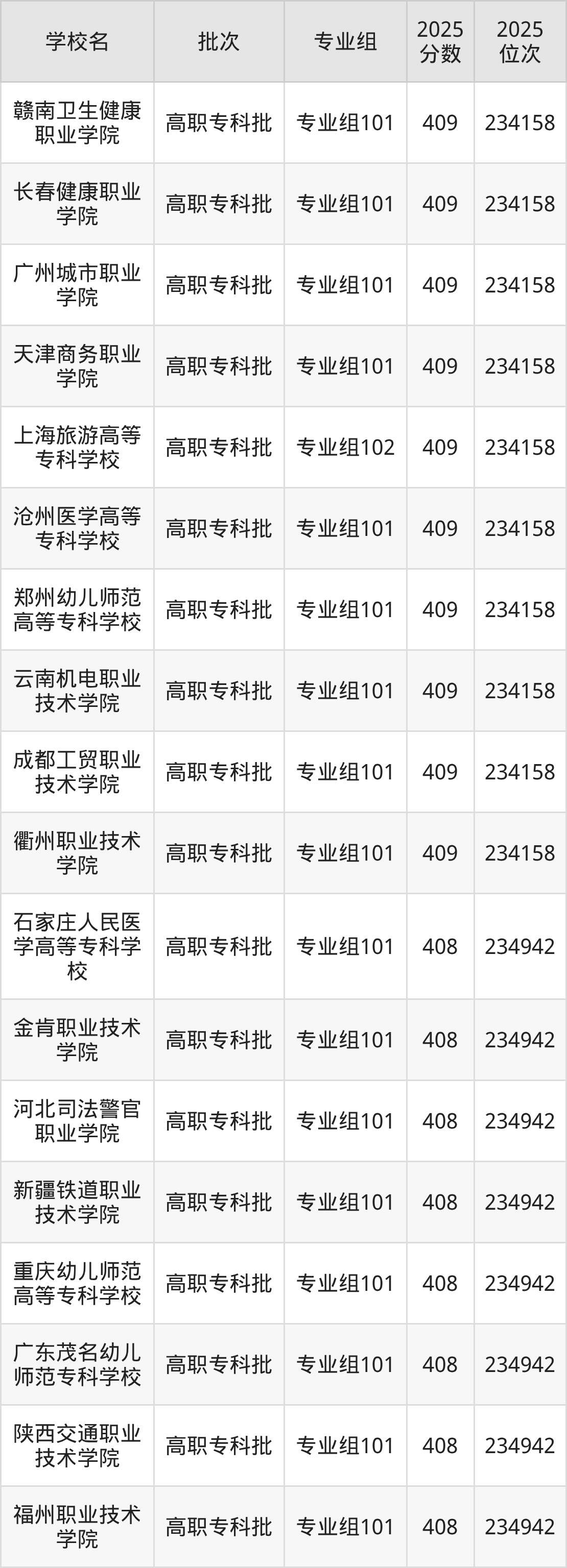 2025年四川高考物理类408分(234159名~234942名)能上的大学有金肯职业技术学院专业组101、福州职业技术学院专业组101、陕西交通职业技术学院专业组101、广东茂名幼儿师范专科学校专业组101等。