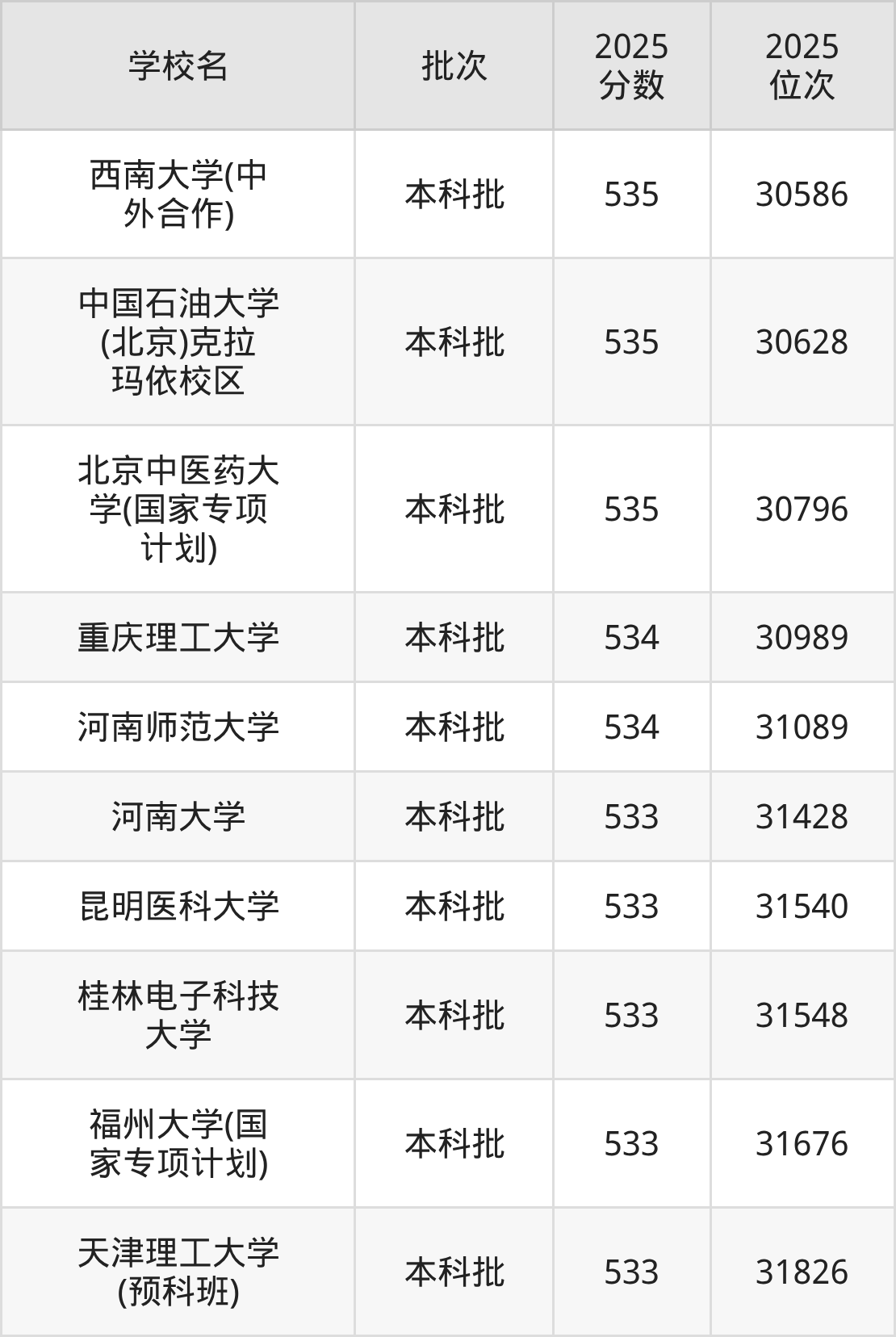 另外录取位次低于该区间(较稳妥)的有河南大学(31428名)、昆明医科大学(31540名)等;录取位次高于该区间(可冲)的有北京中医药大学(国家专项计划)(30796名)、中国石油大学(北京)克拉玛依校区(30628名)等。
