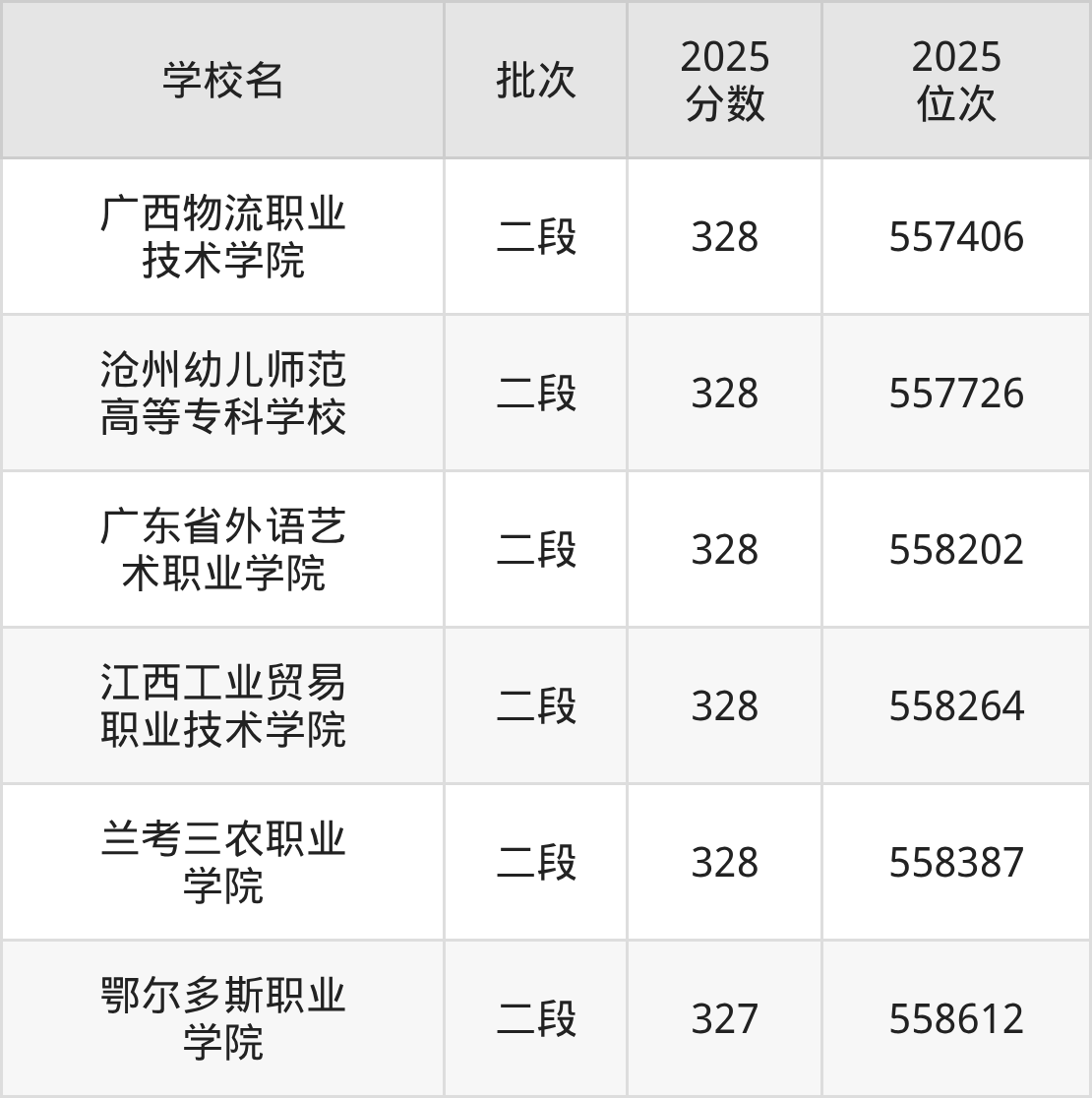 2025年山东高考328分(557048名~558575名)能上的大学有沧州幼儿师范高等专科学校、广西物流职业技术学院、江西工业贸易职业技术学院、兰考三农职业学院等。