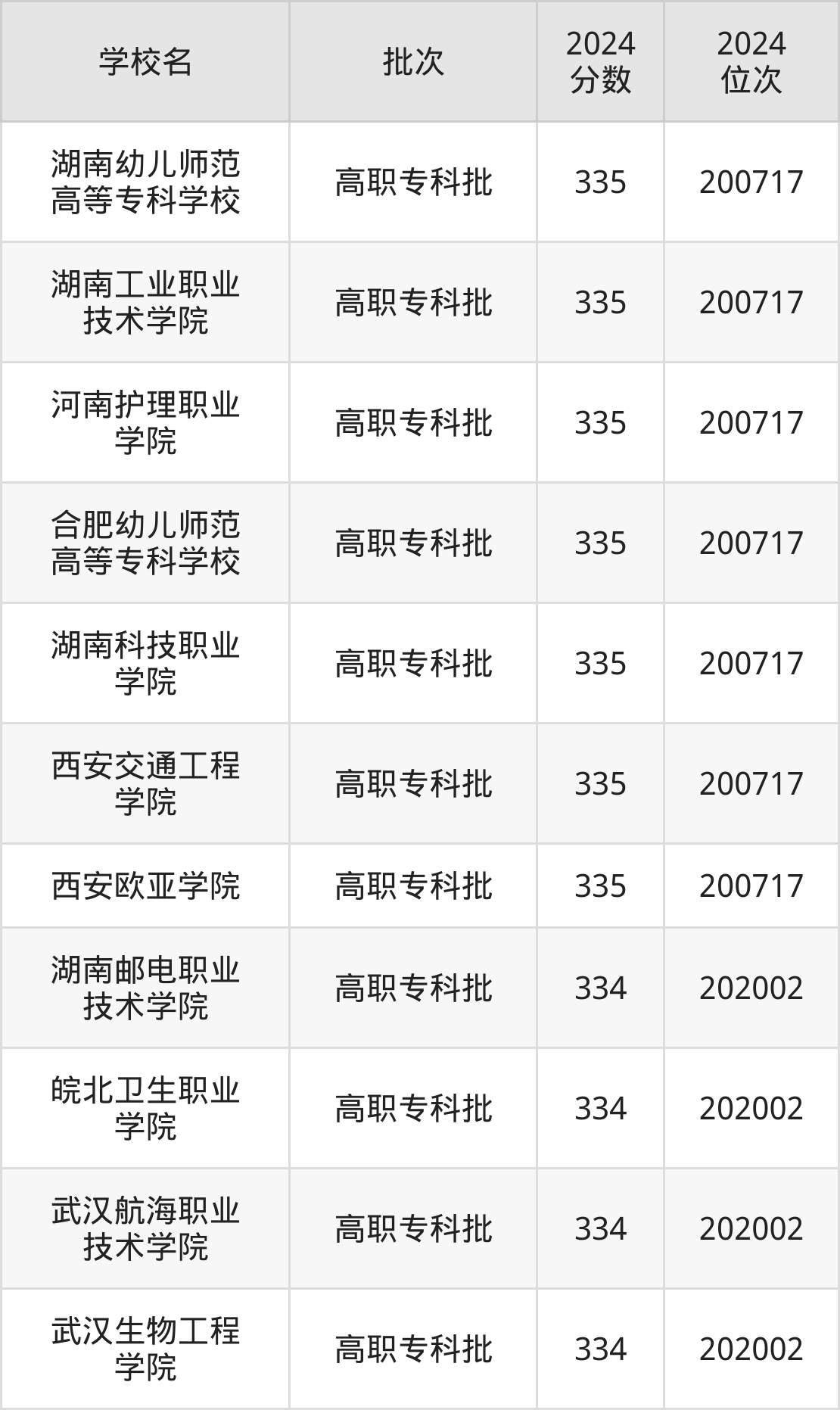 2024年河南高考文科334分(200718名~202002名)能上的大学有武汉生物工程学院、武汉航海职业技术学院、皖北卫生职业学院、湖南邮电职业技术学院。