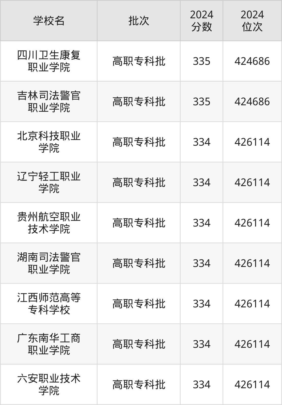 另外录取位次低于该区间(较稳妥)的有山东劳动职业技术学院(427505名)、新疆司法警官职业学院(427505名)等;录取位次高于该区间(可冲)的有吉林司法警官职业学院(424686名)、四川卫生康复职业学院(424686名)等。