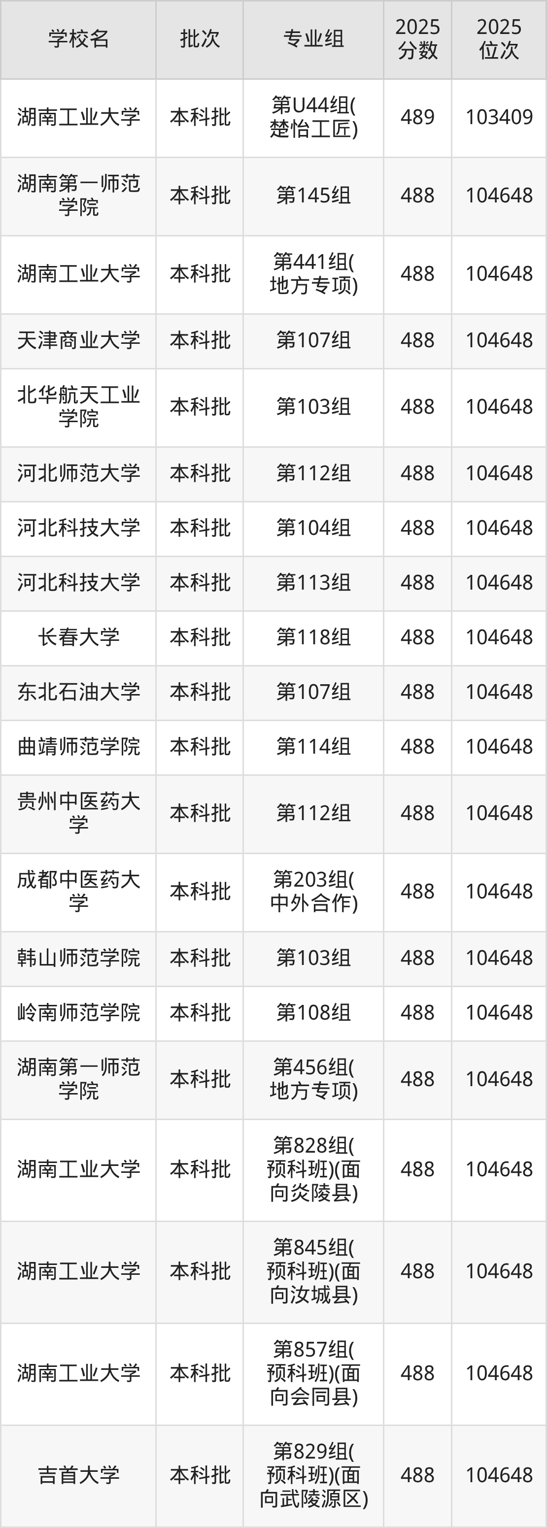2025年湖南高考物理类488分(103410名~104648名)能上的大学有天津商业大学第107组、北华航天工业学院第103组、河北师范大学第112组、河北科技大学第104组等。